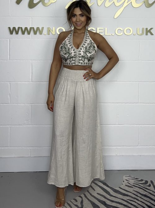Neutral Woven Effect Cropped Vest Top & Wide Leg Trouser Co-Ord 1030