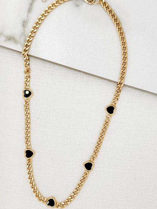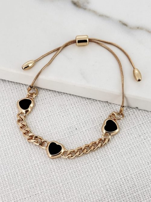Gold Drawstring Chain Bracelet With Black Hearts 8802