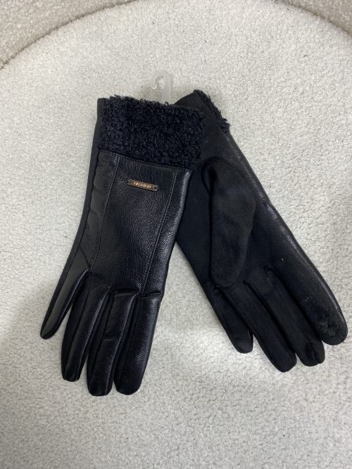 Black Leather Look Faux Shearling Trim Gloves 7830