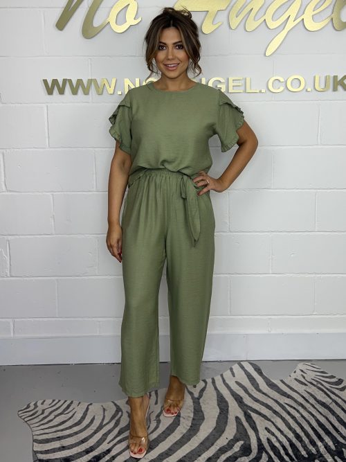 Khaki Frill Sleeve Top & trouser Co-Ord 851