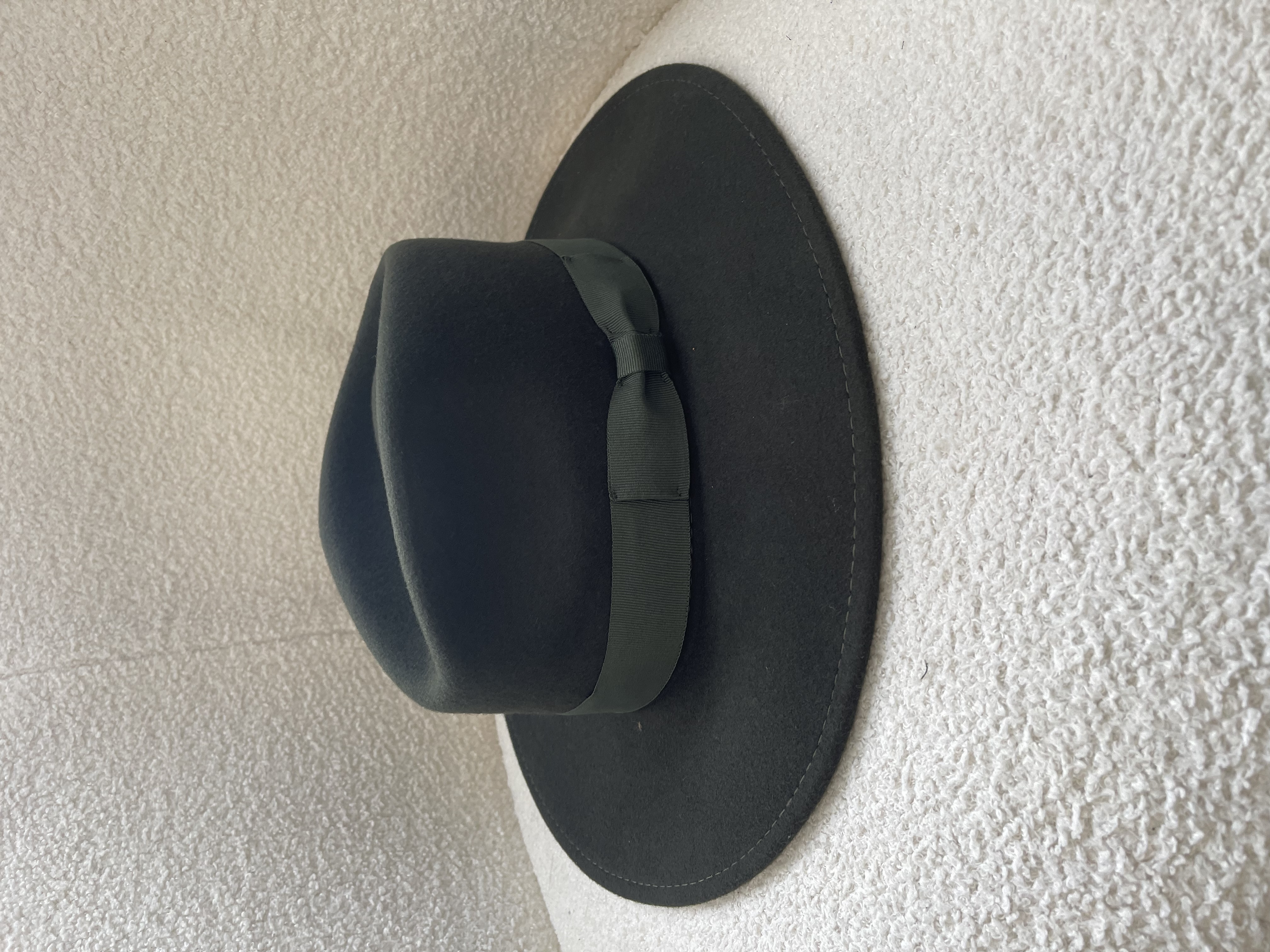 Army Green Wide Brim Fedora Hat With Brown Band.