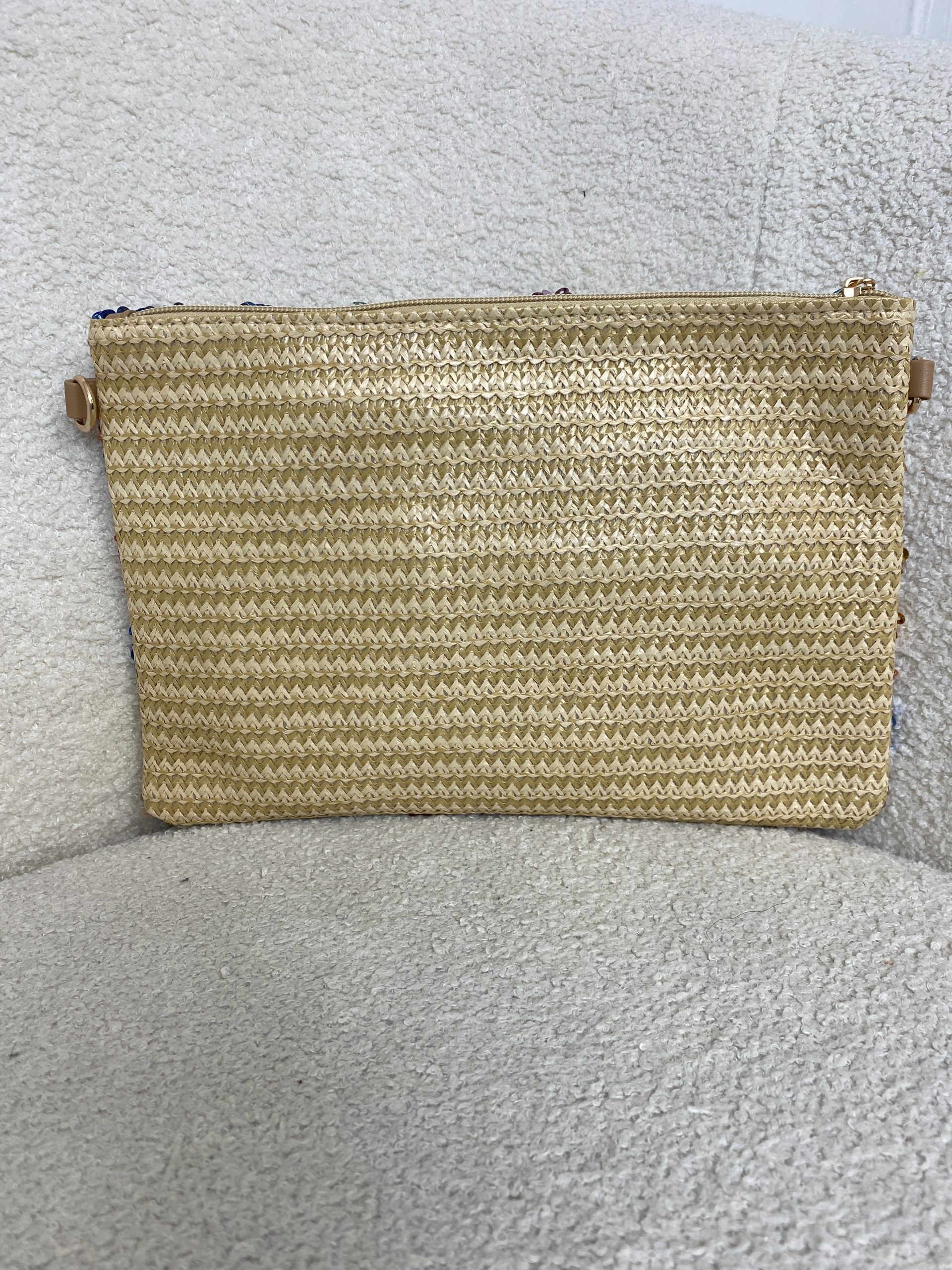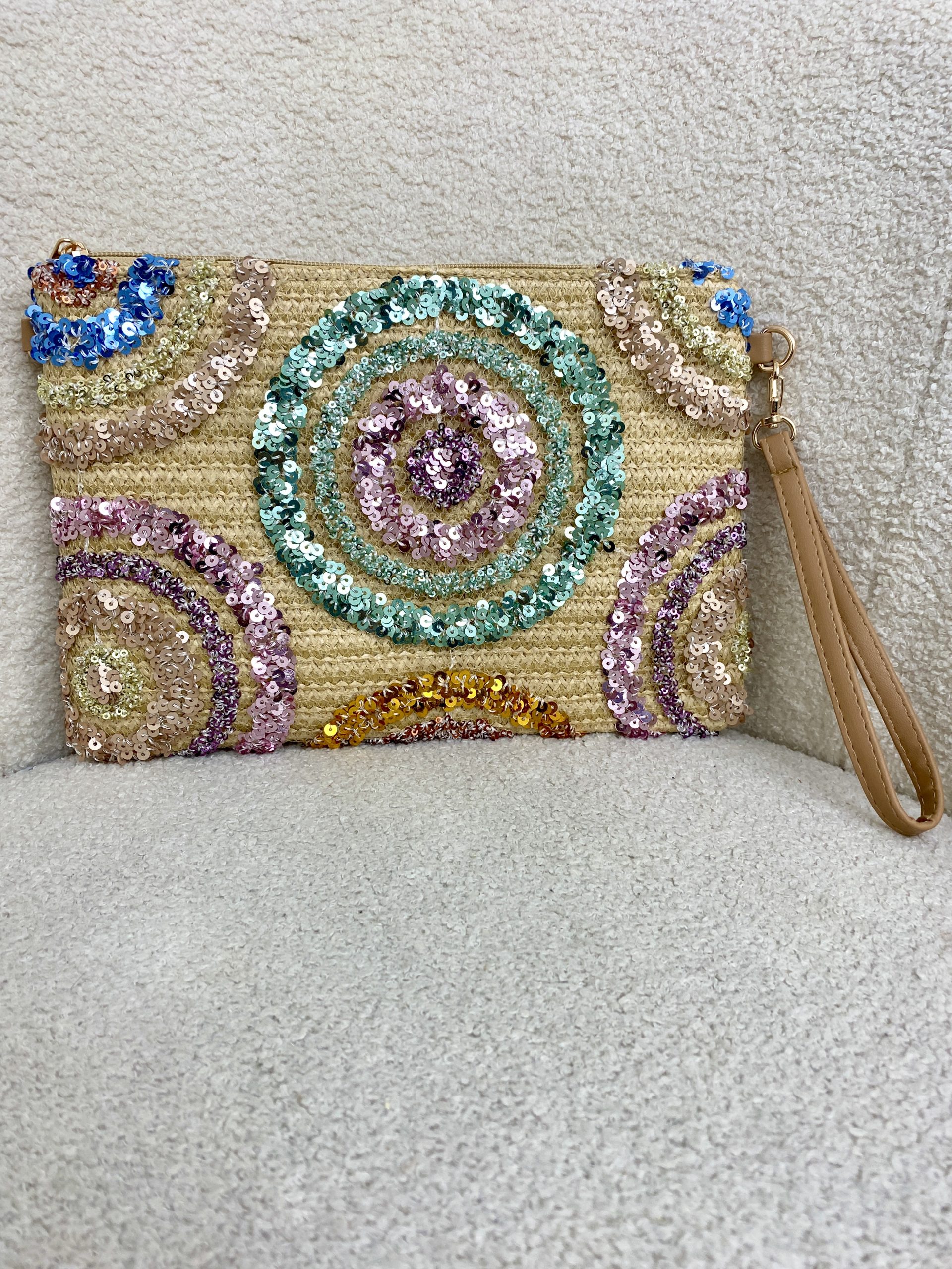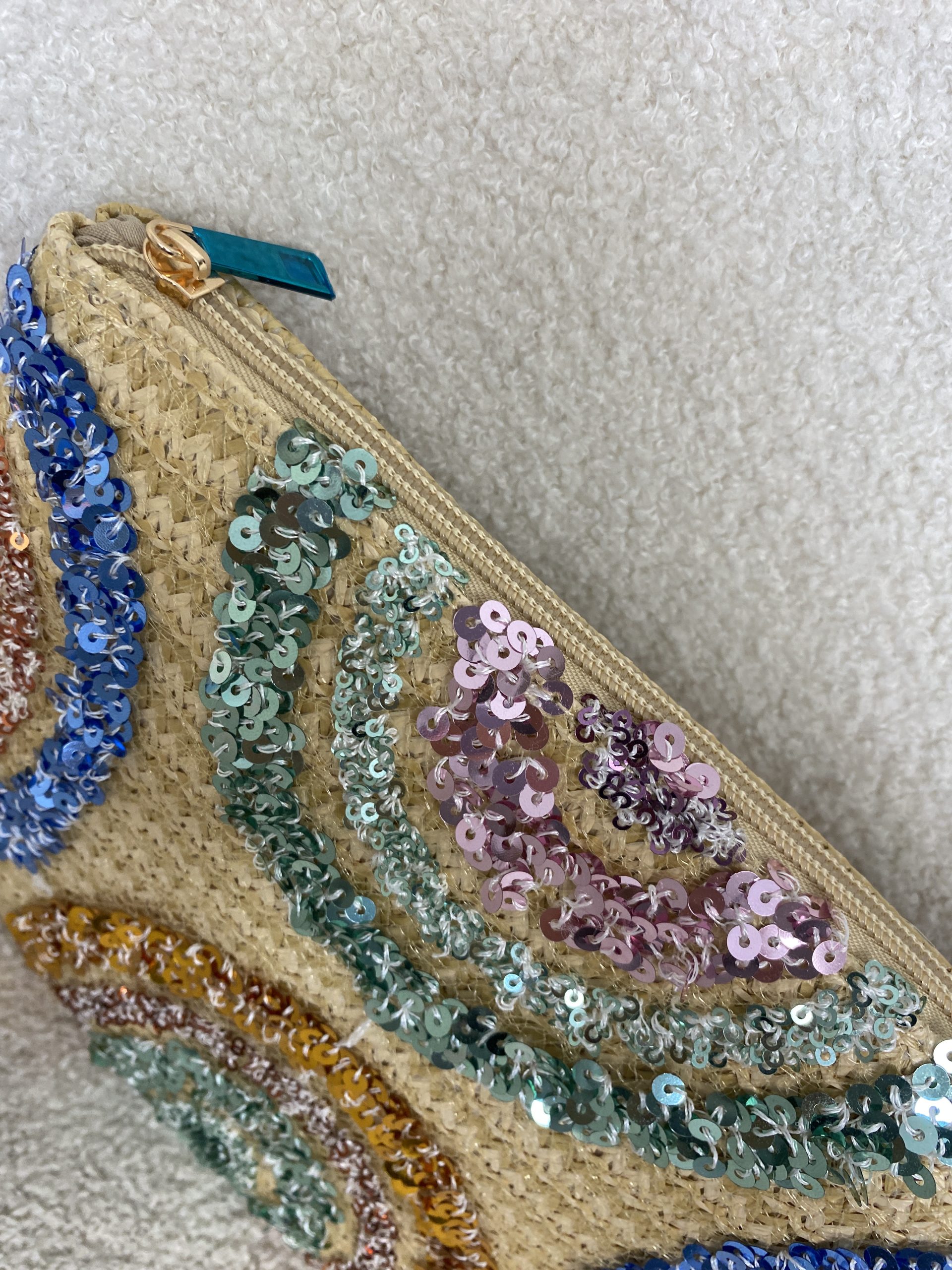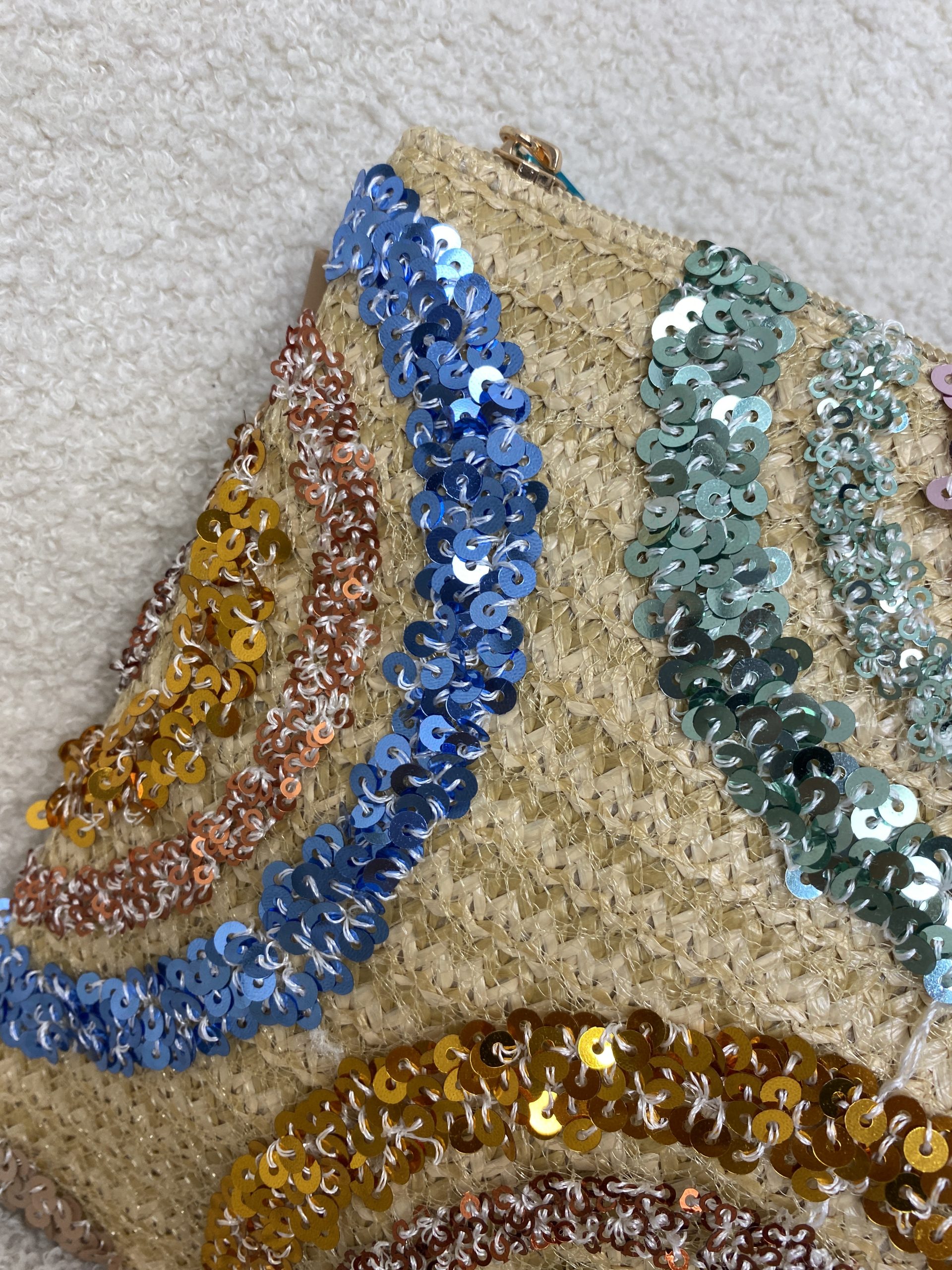 Woven Straw Clutch Bag , Full Zipper , Sequin Circle Detail.