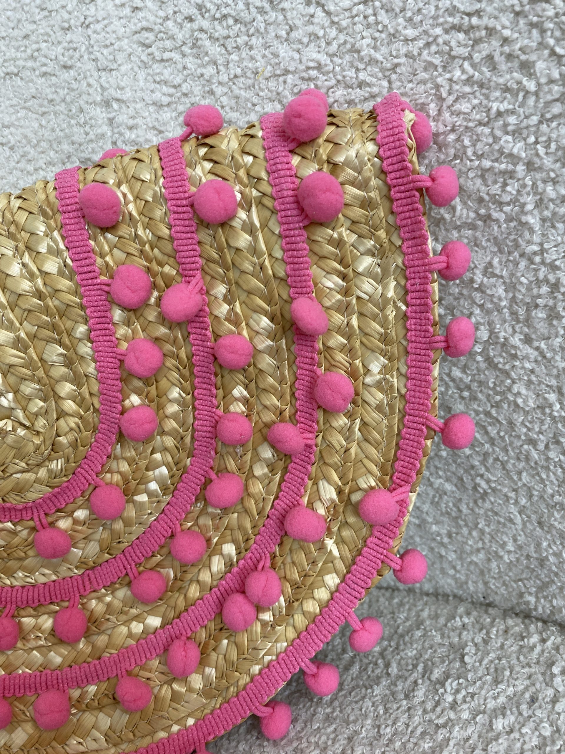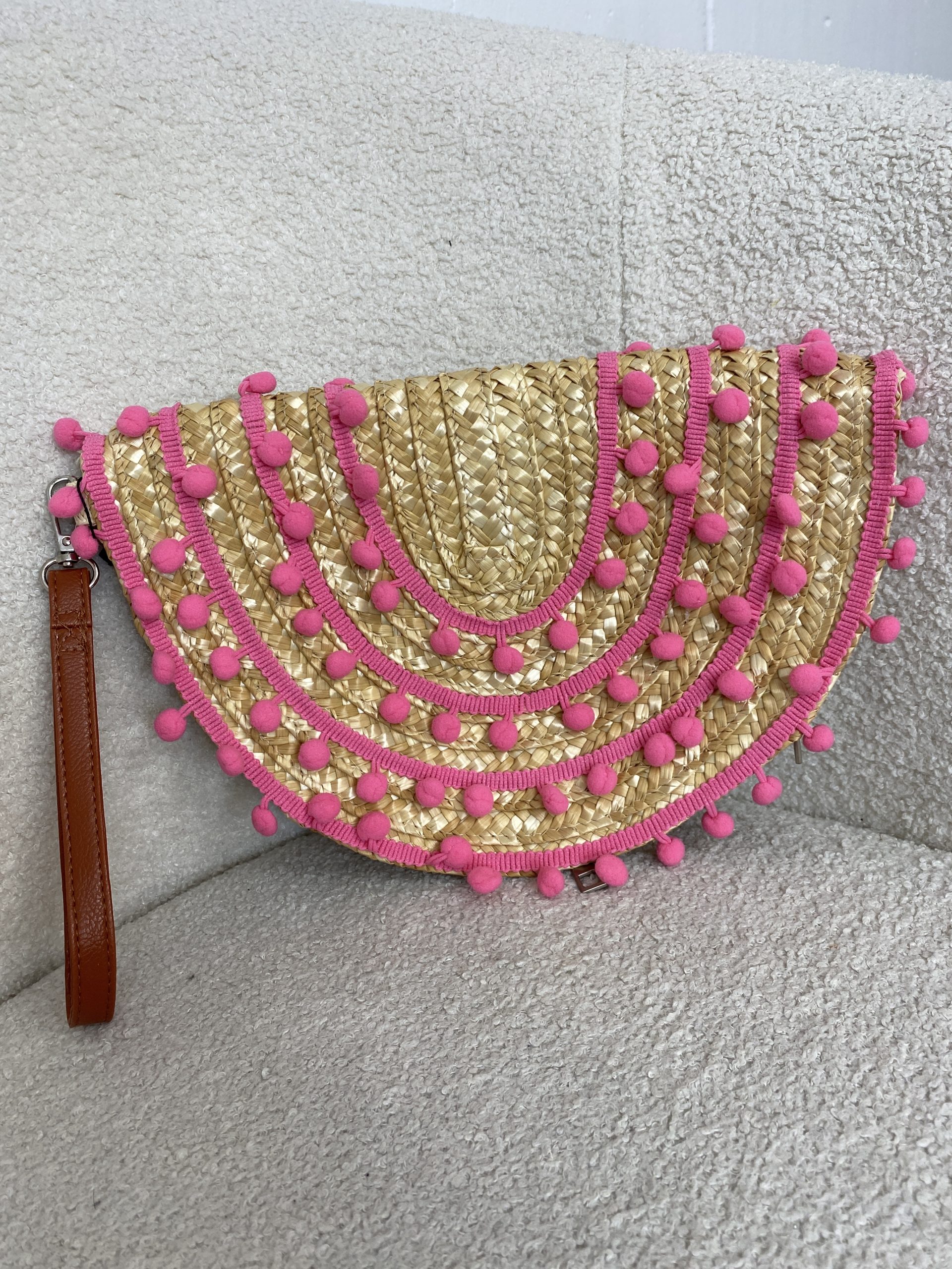 Pink Pom Pom Clutch Bag , Envelope Style , Leather Look Side Strap.