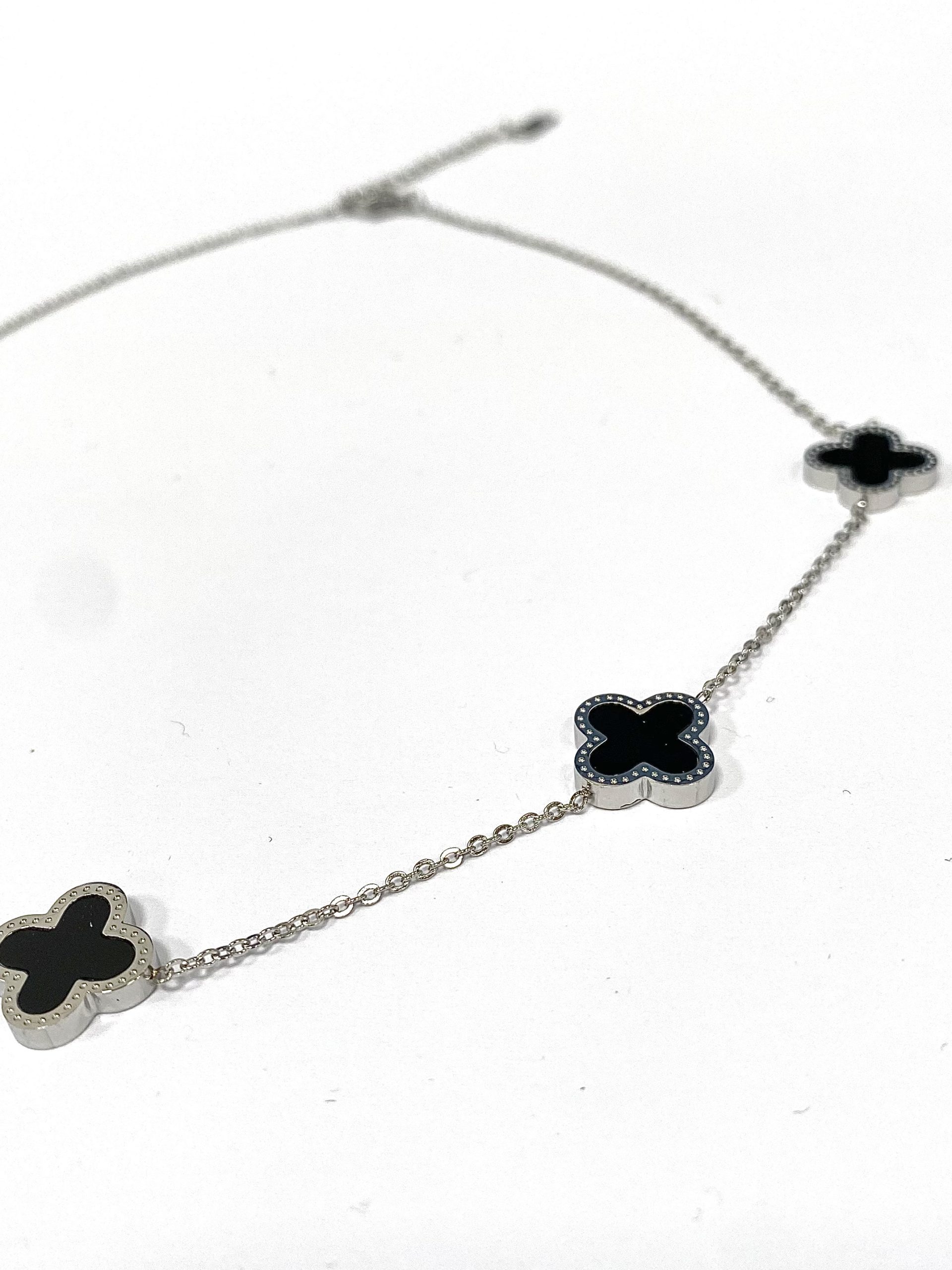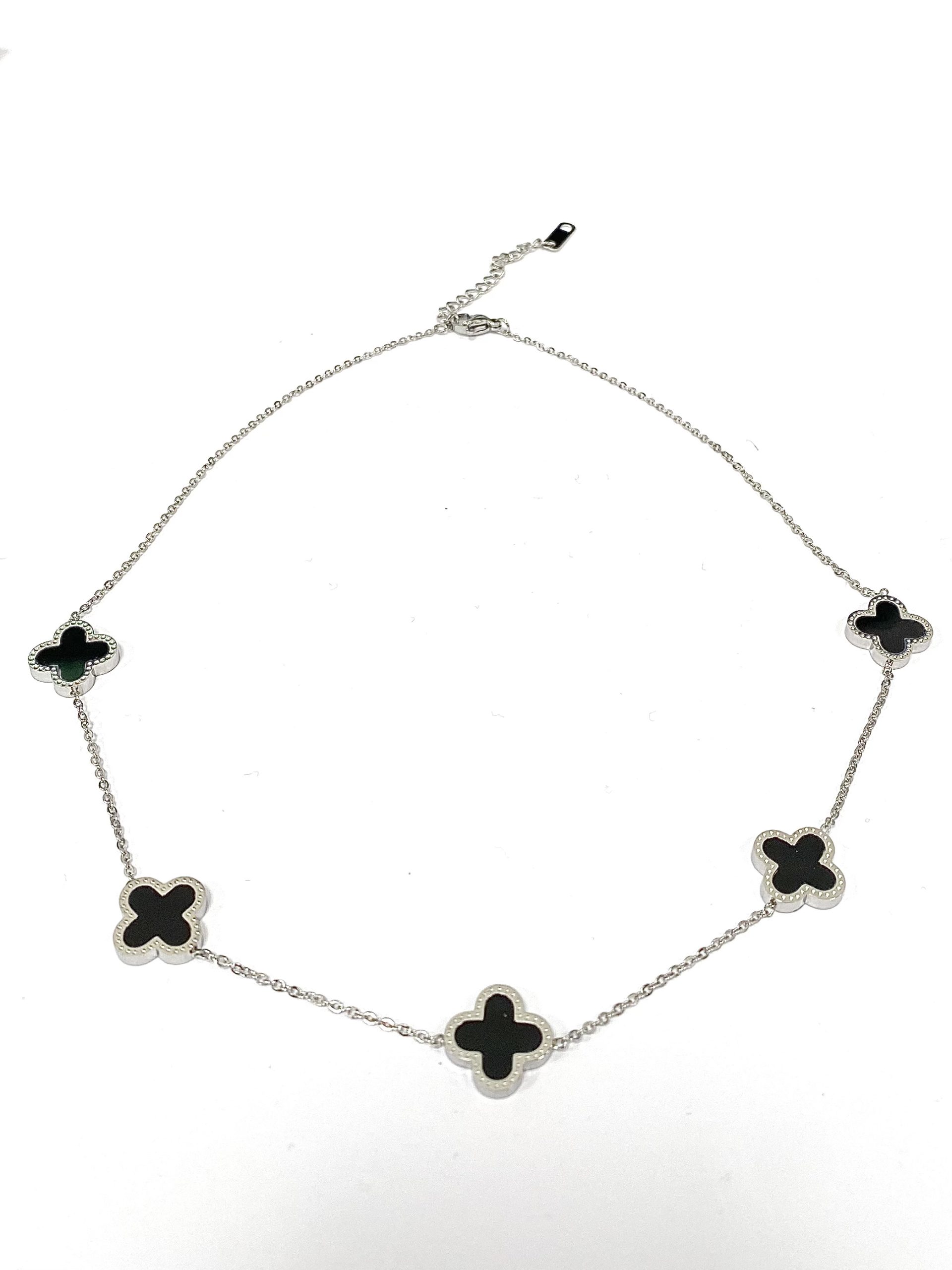 5 Clover Necklace , Black Clovers On A Delicate Silver Chain.