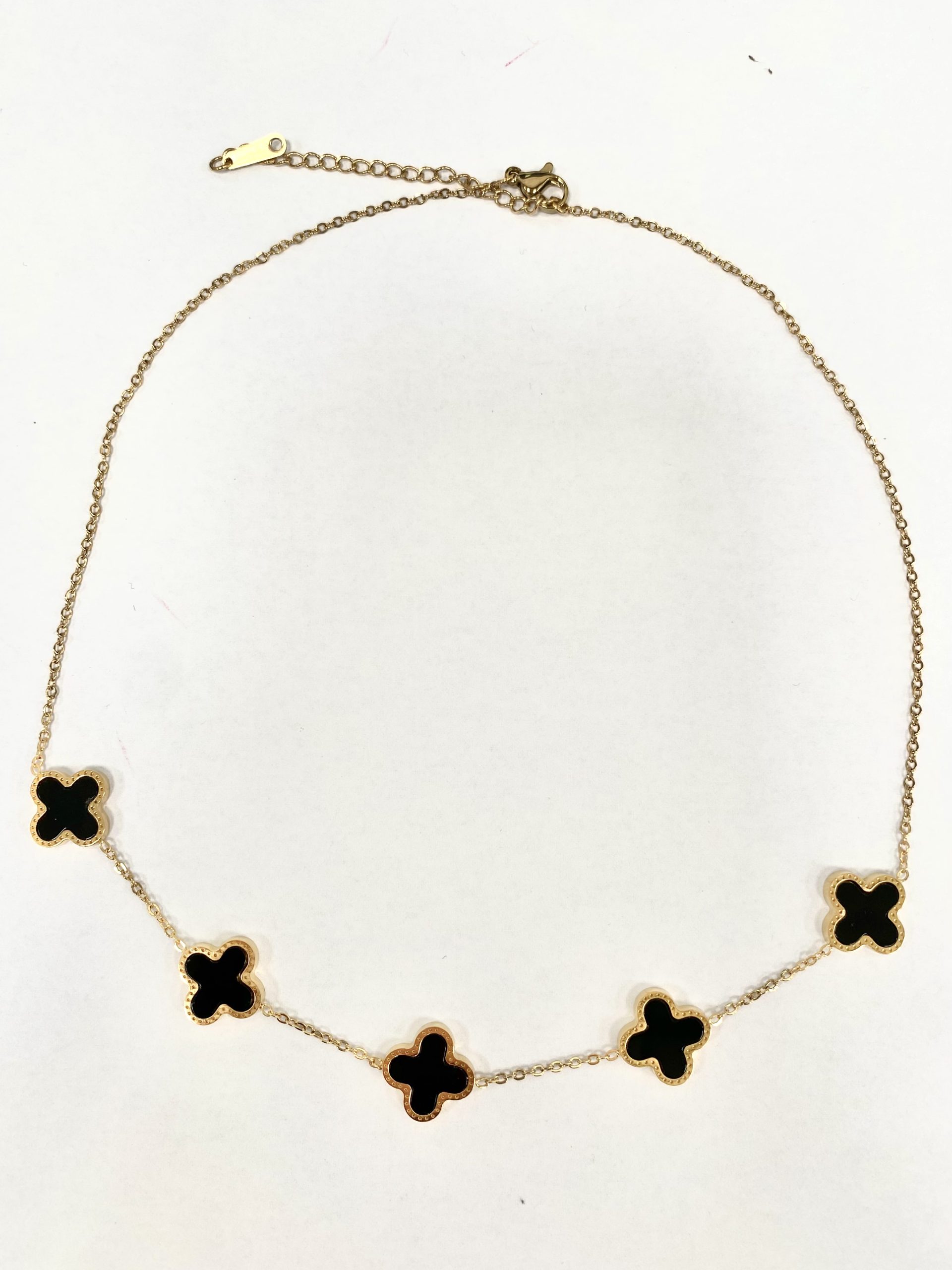 5 Clover Necklace , Black On A Delicate Gold Chain.