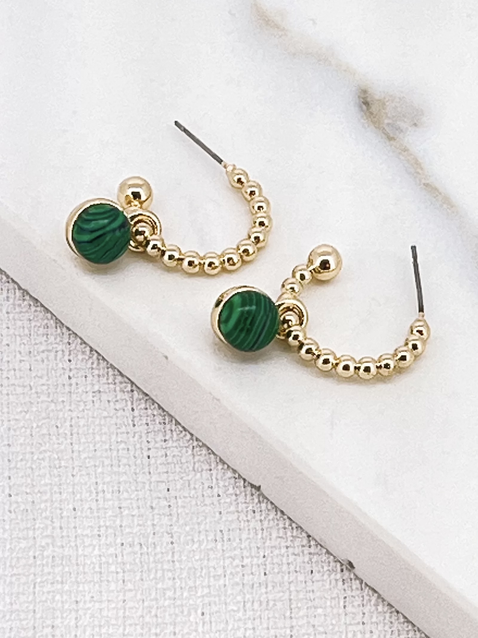 Gold beaded hoop with green semi precious stone dropper.