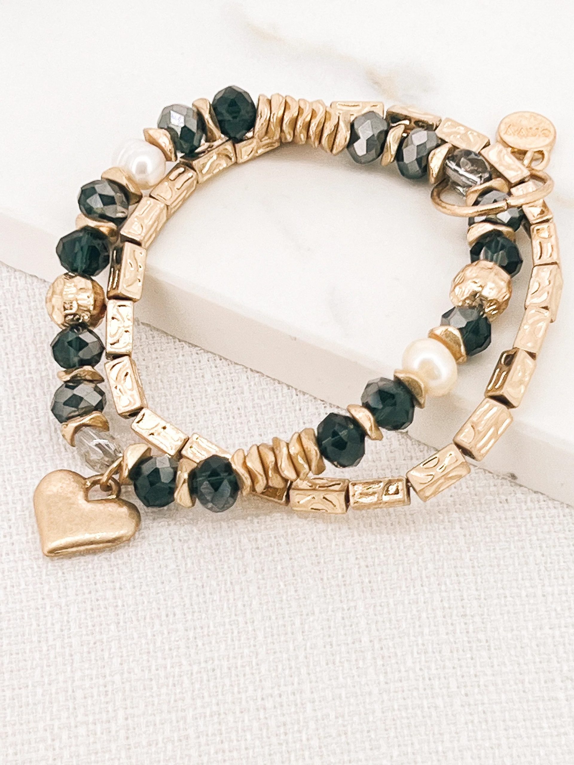 Gold and black double layer stretch bracelet with heart pendant