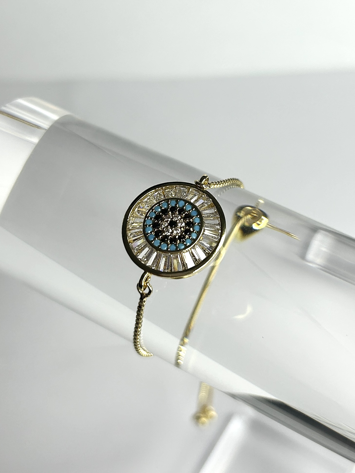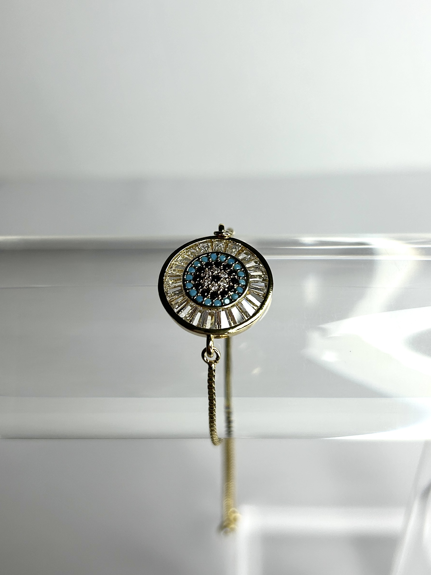 Gold Bracelet with Detail Circle Pendant. Filled with Silver, Black & Blue Multi Gems.