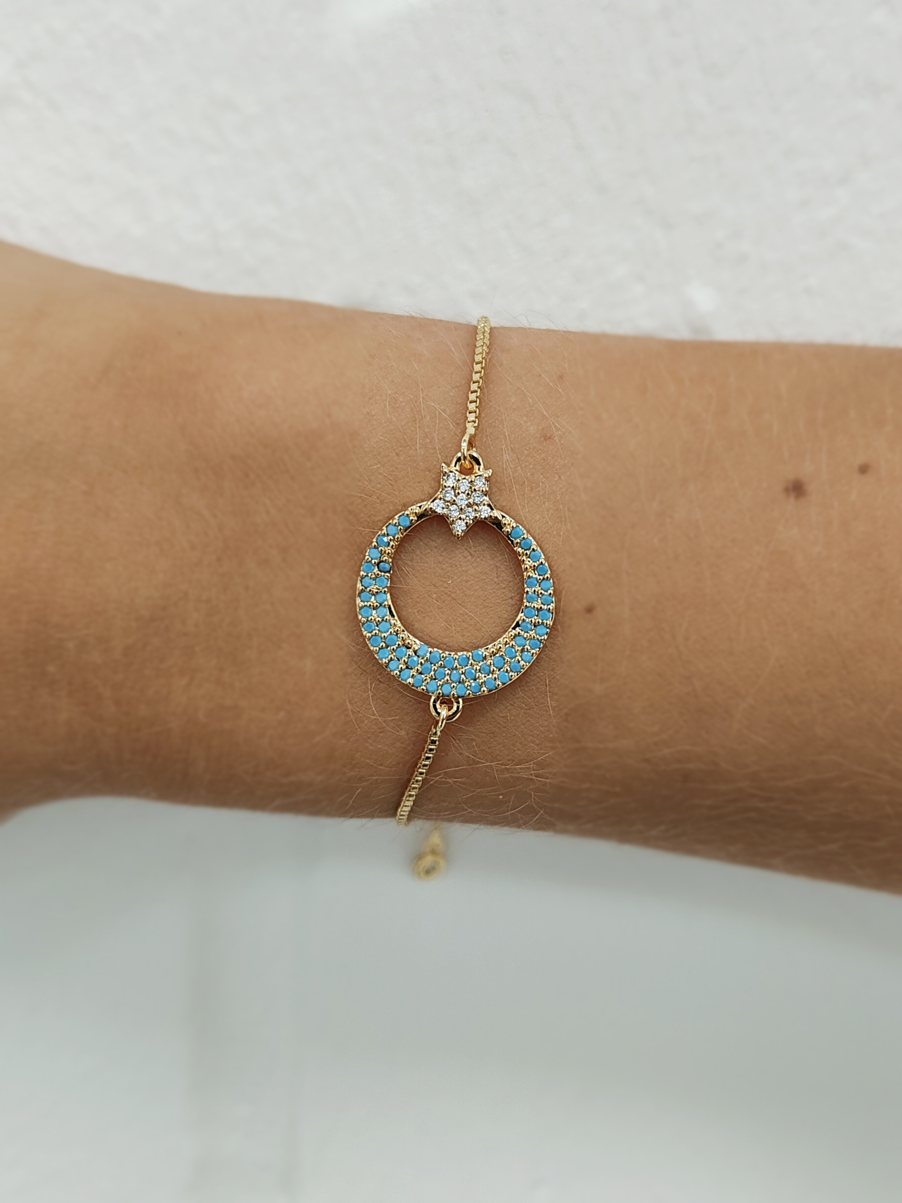 Gold Bracelet with Moon & Star Pendant. Moon: Blue Gems. Star: Silver Gems