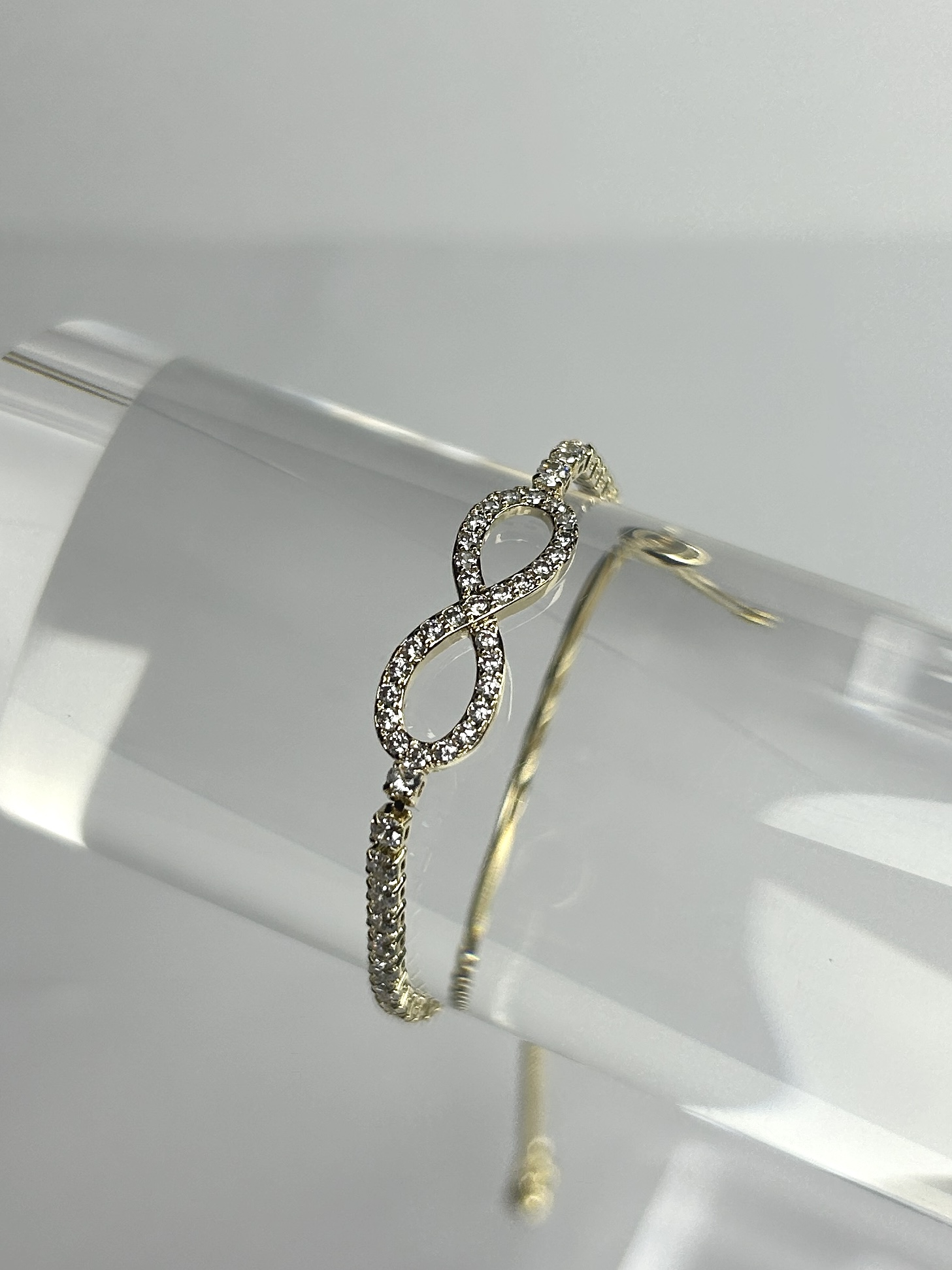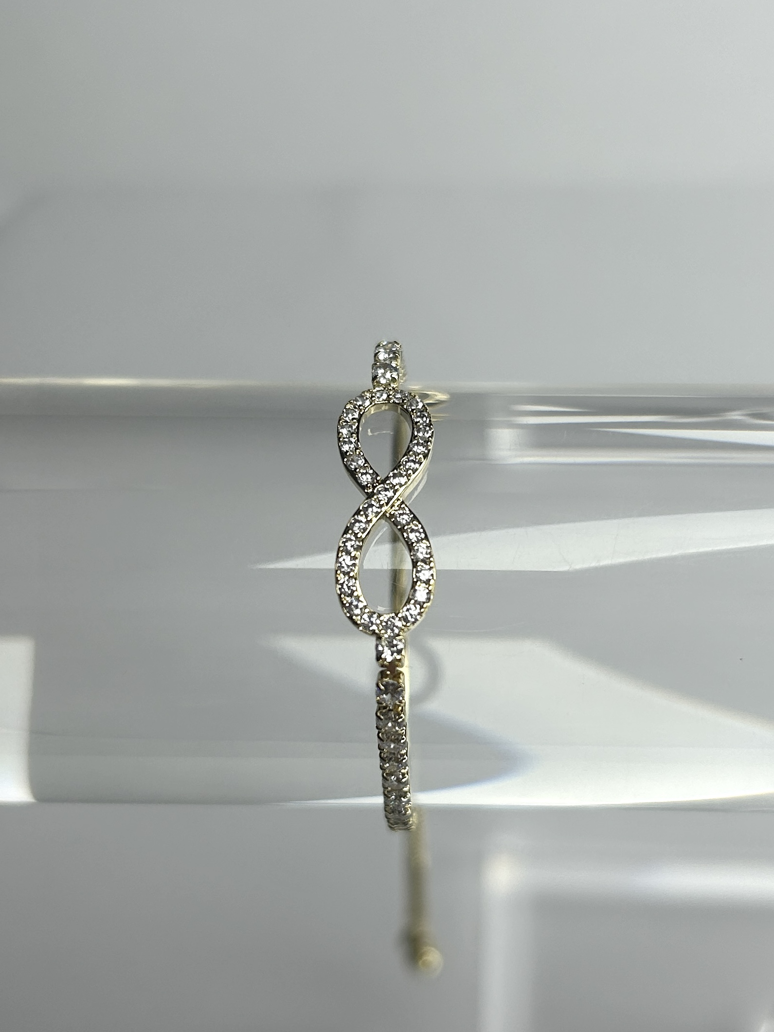 Gold Bracelet With Infinity Pendant, filled with Silver Gems, and Between Silver Gems on the bracelet