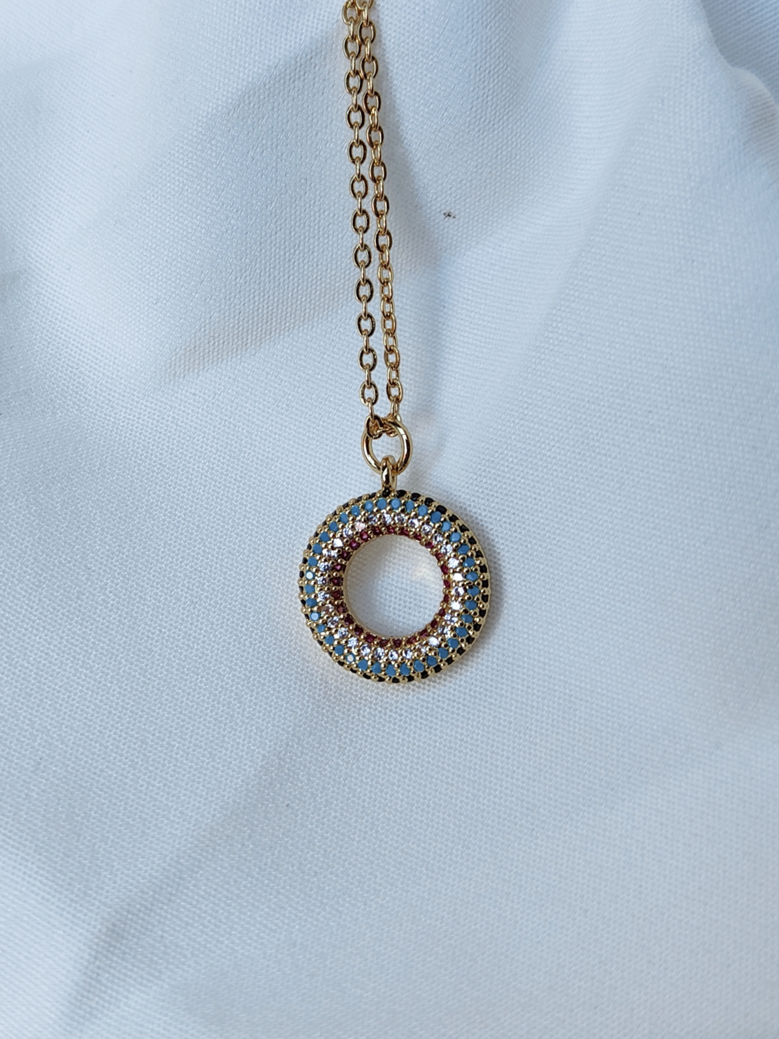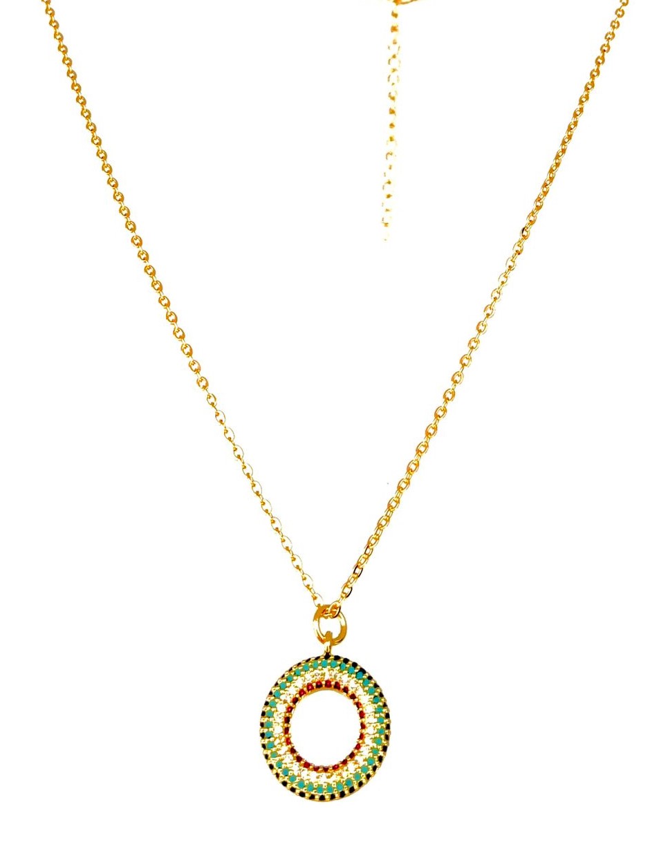 Gold Long Necklace With Circle Pendant of Small Black, Blue, Silver & Pink Gems – Matches Gold Bracelet 2283