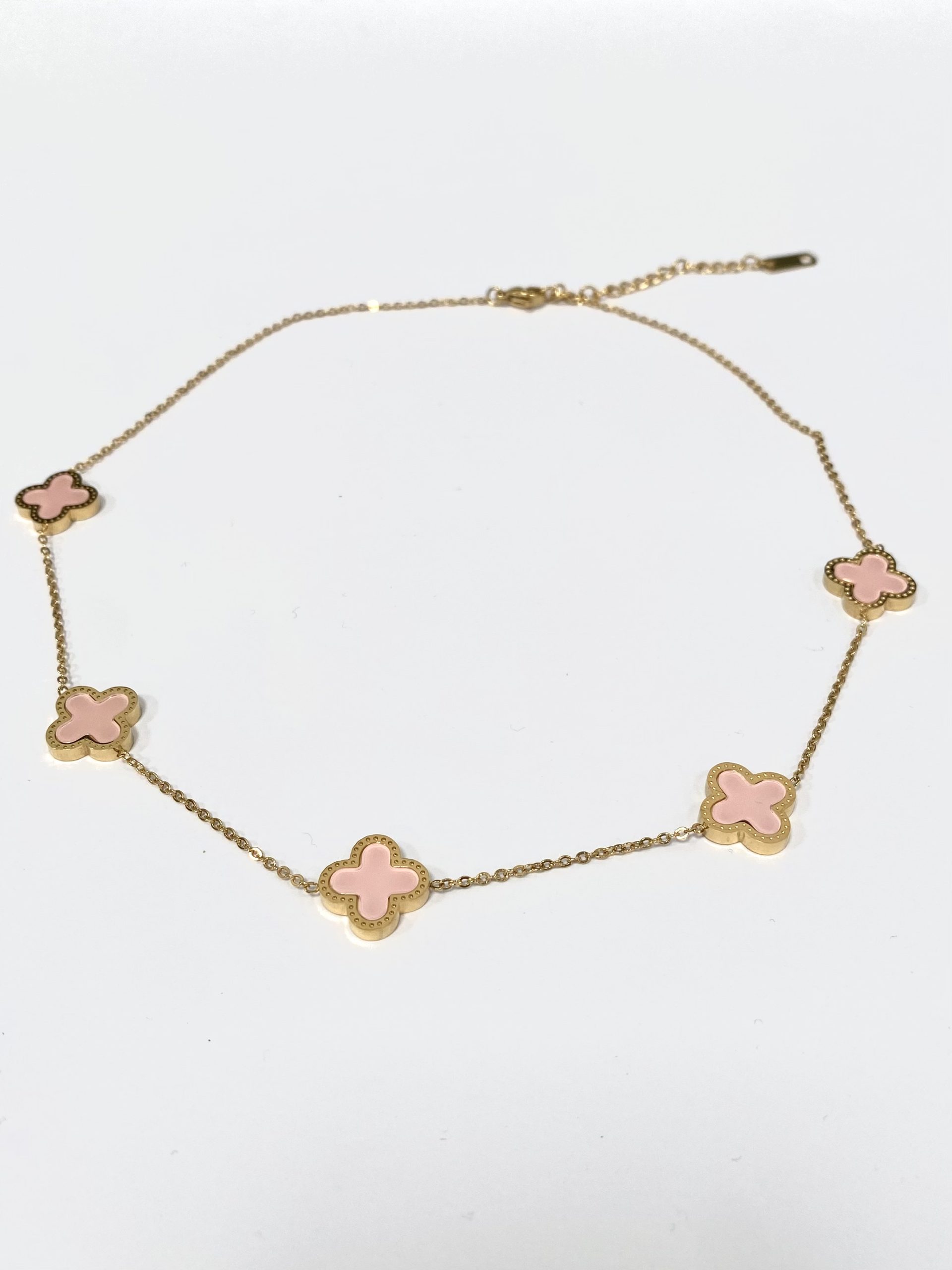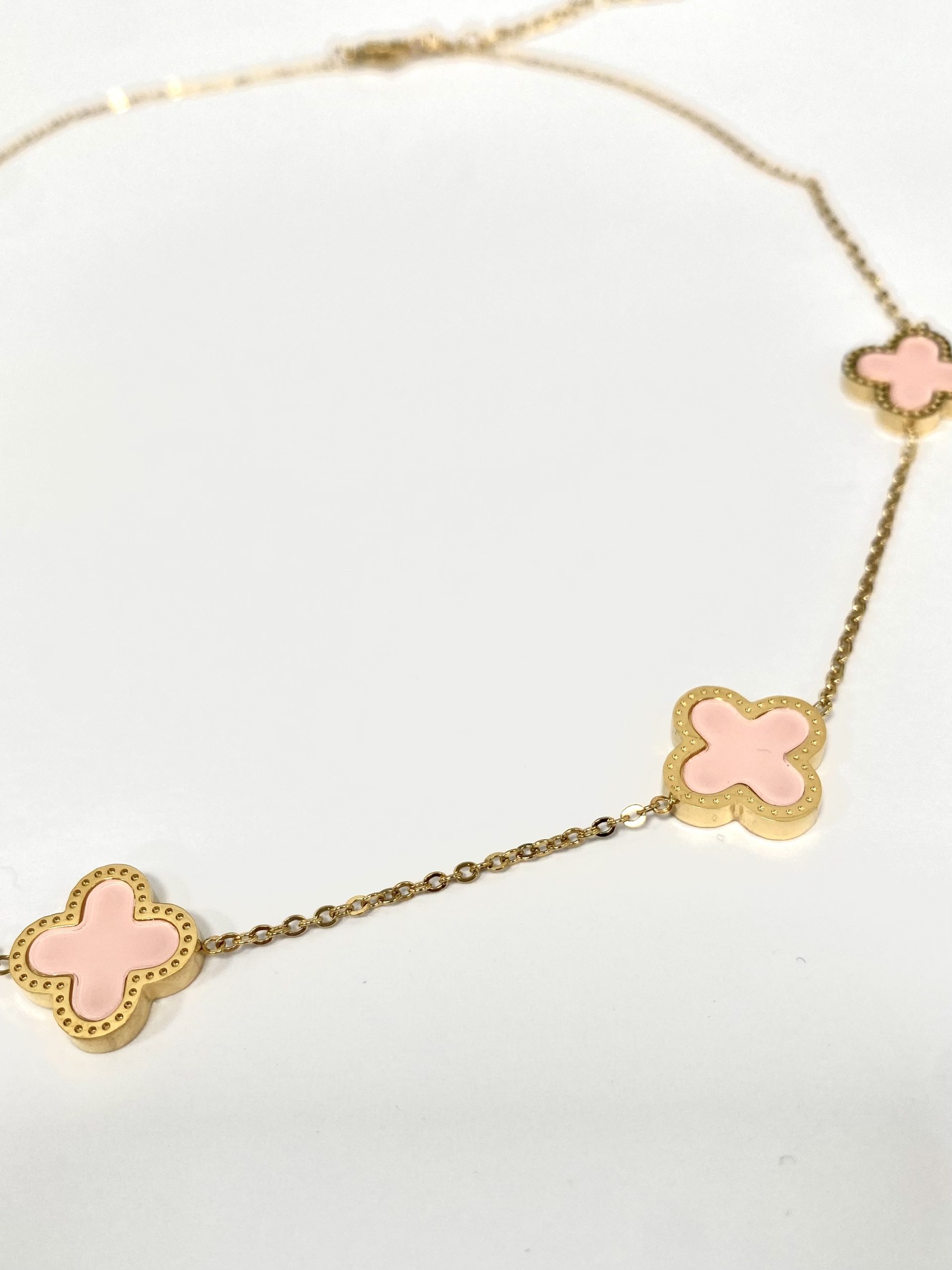 5 Clover Necklace , Pink On A Delicate Gold Chain.
