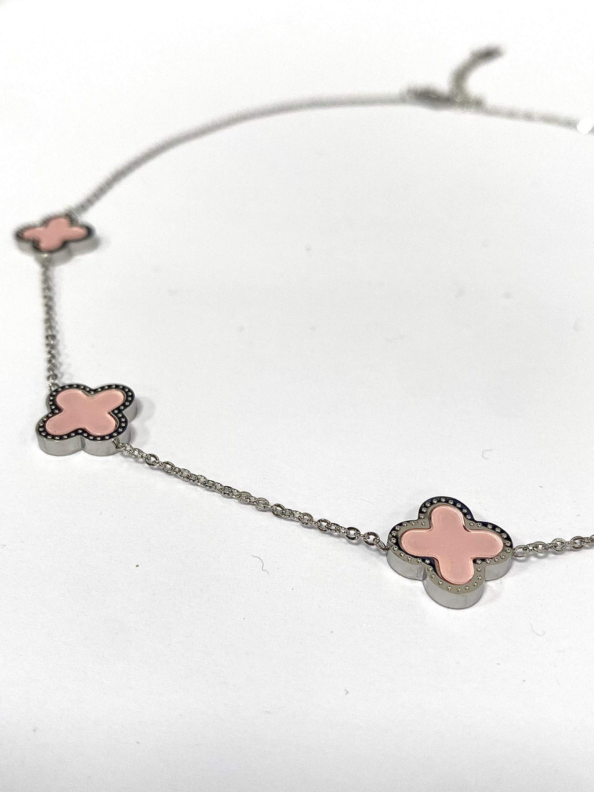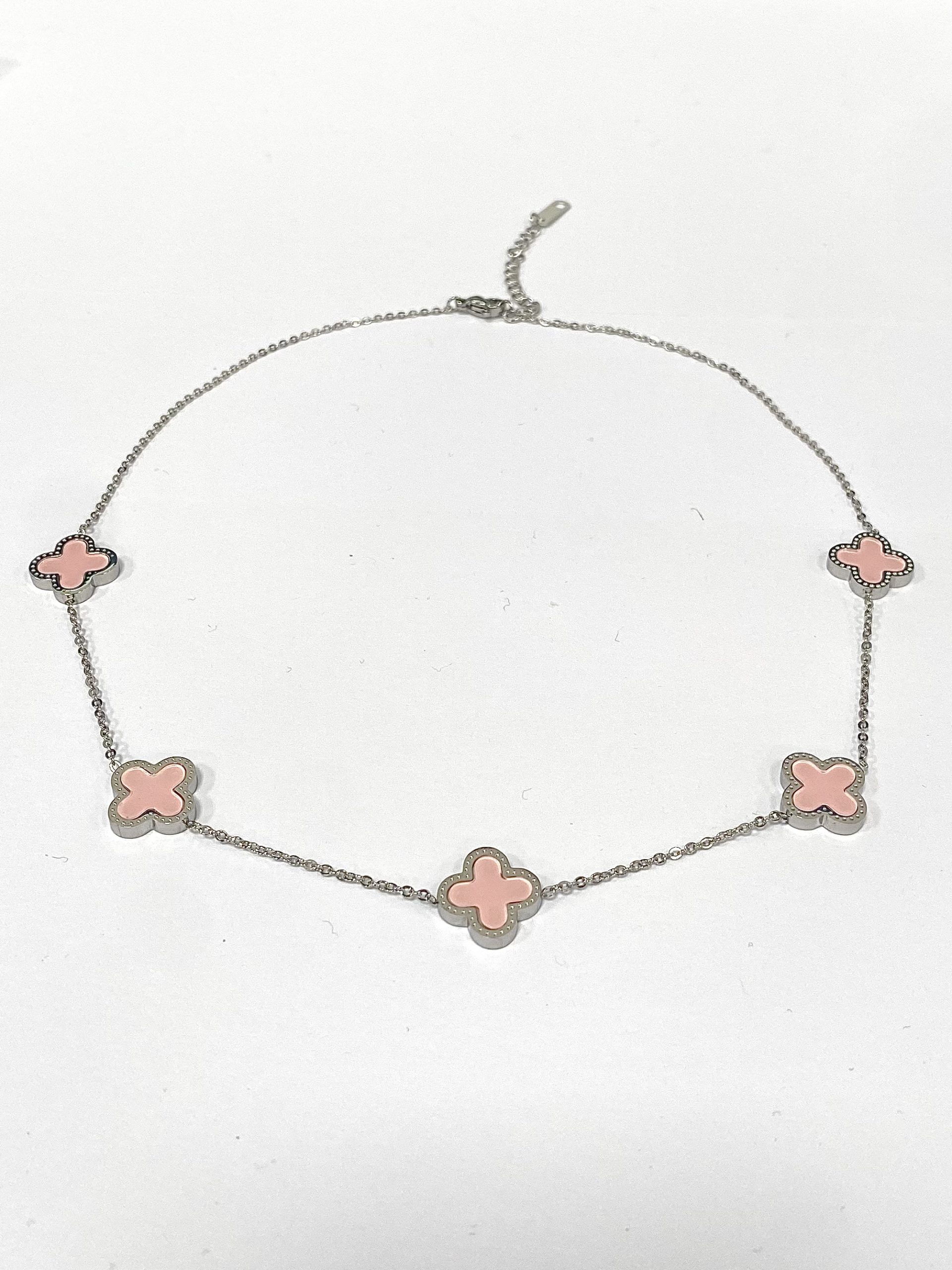5 Clover Necklace , Pink On A Delicate Silver Chain.