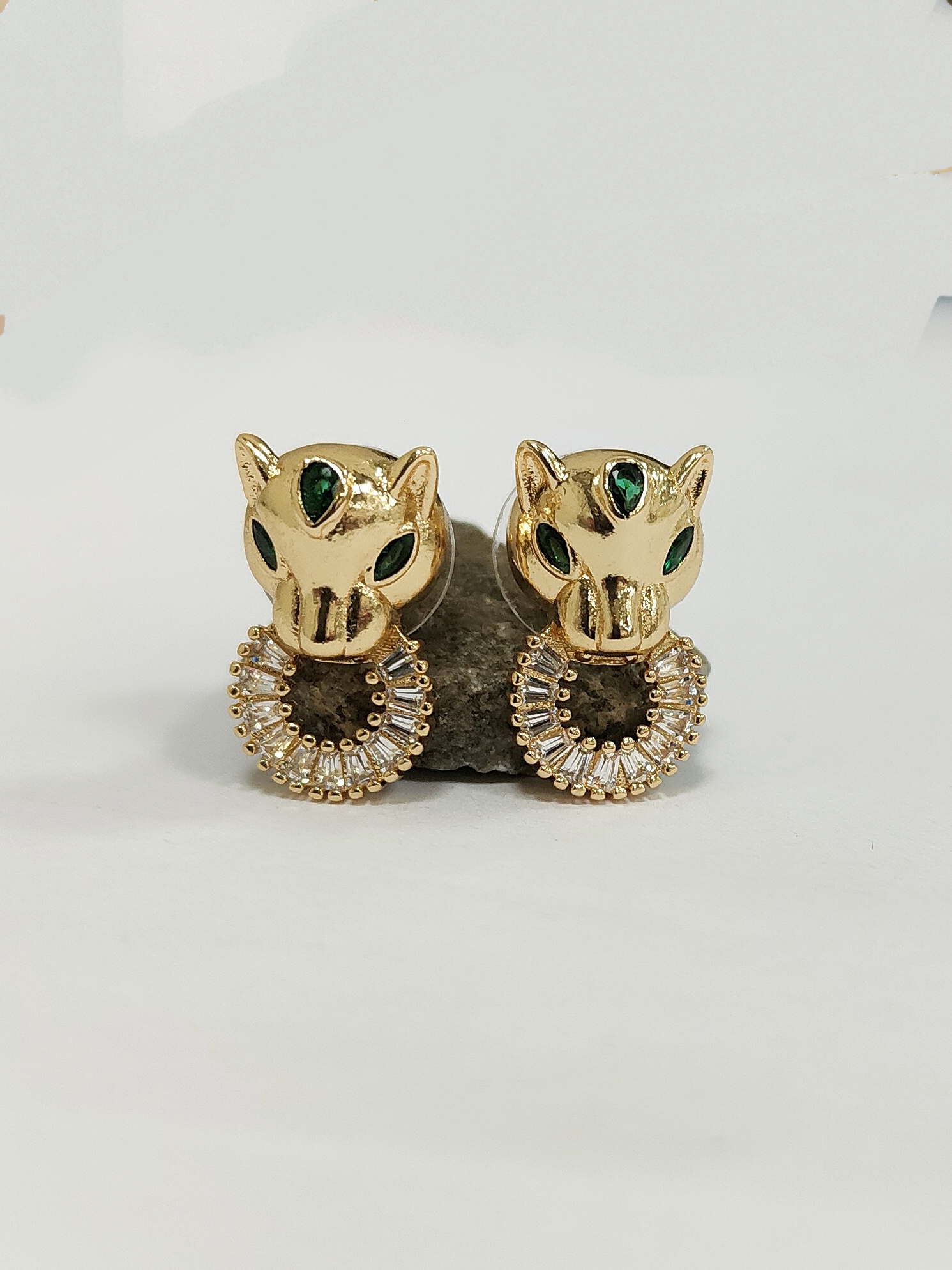 Gold Small Panther Earrings With Emerald and Silver Gems