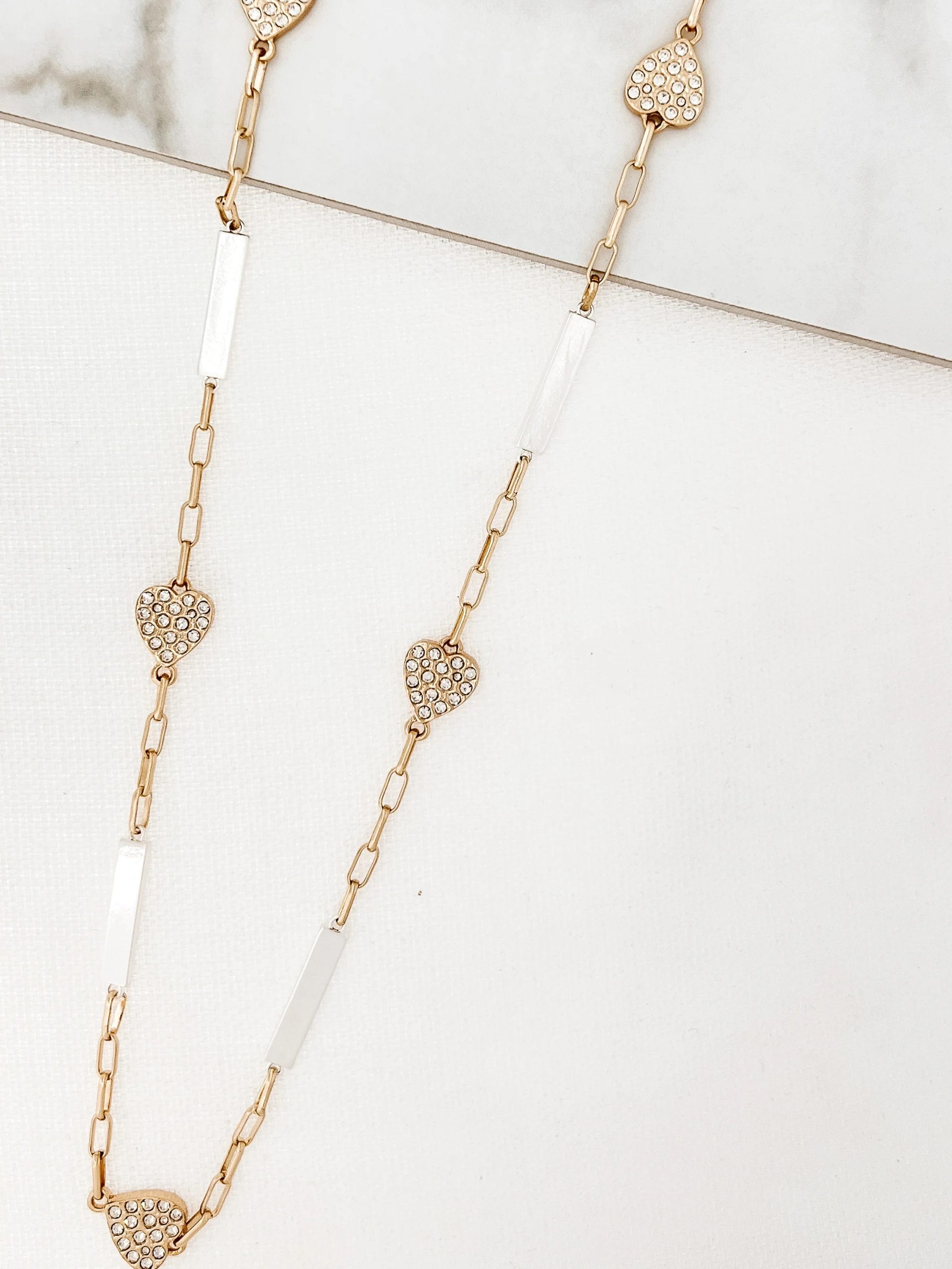 Long gold and silver necklace with diamante hearts and bars