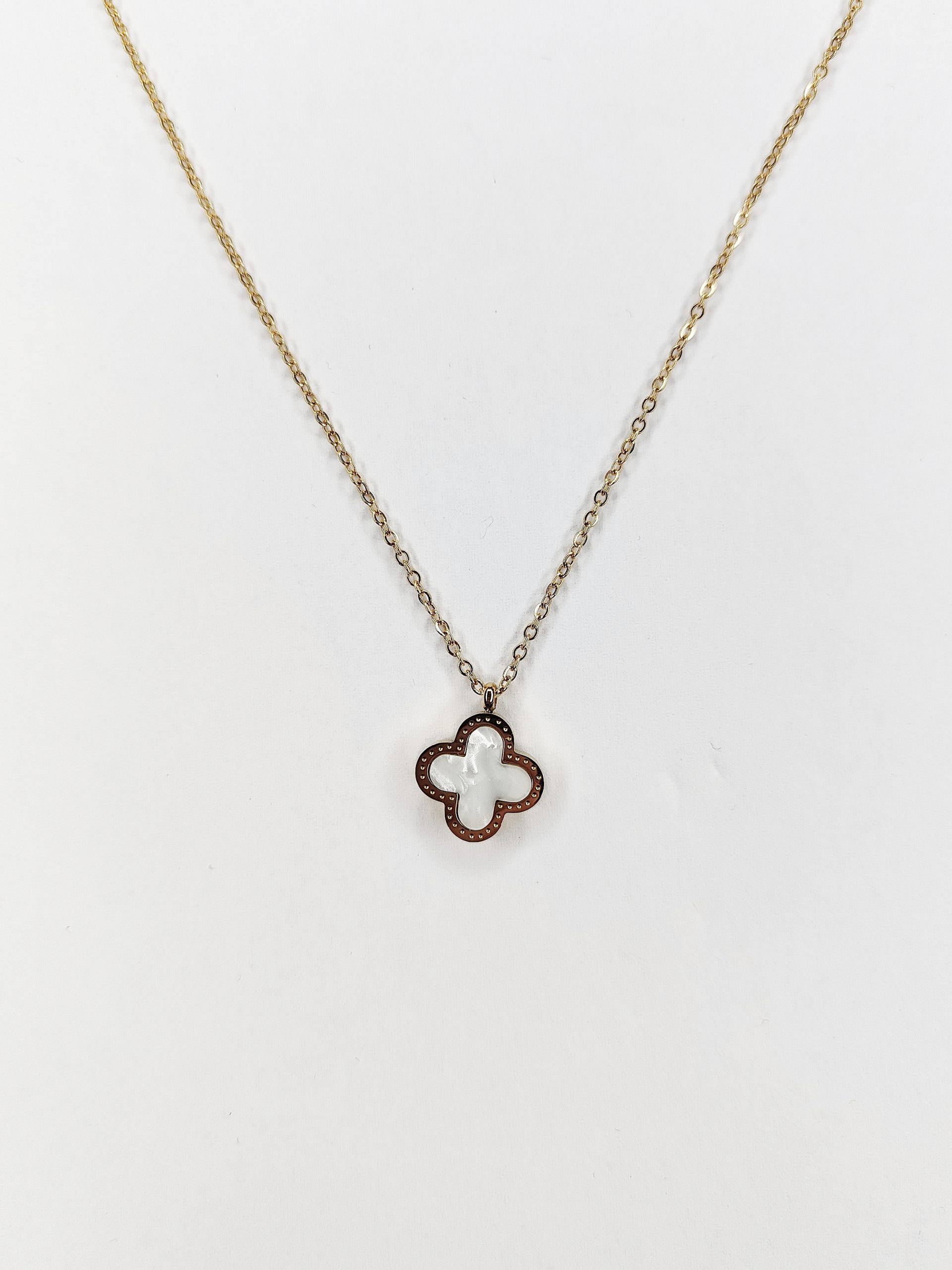 Reversible Clover Necklace , Can Be Worn Both Sides , 2 Necklaces in 1 , Green Or Pearl White On A Delicate Gold Chain.