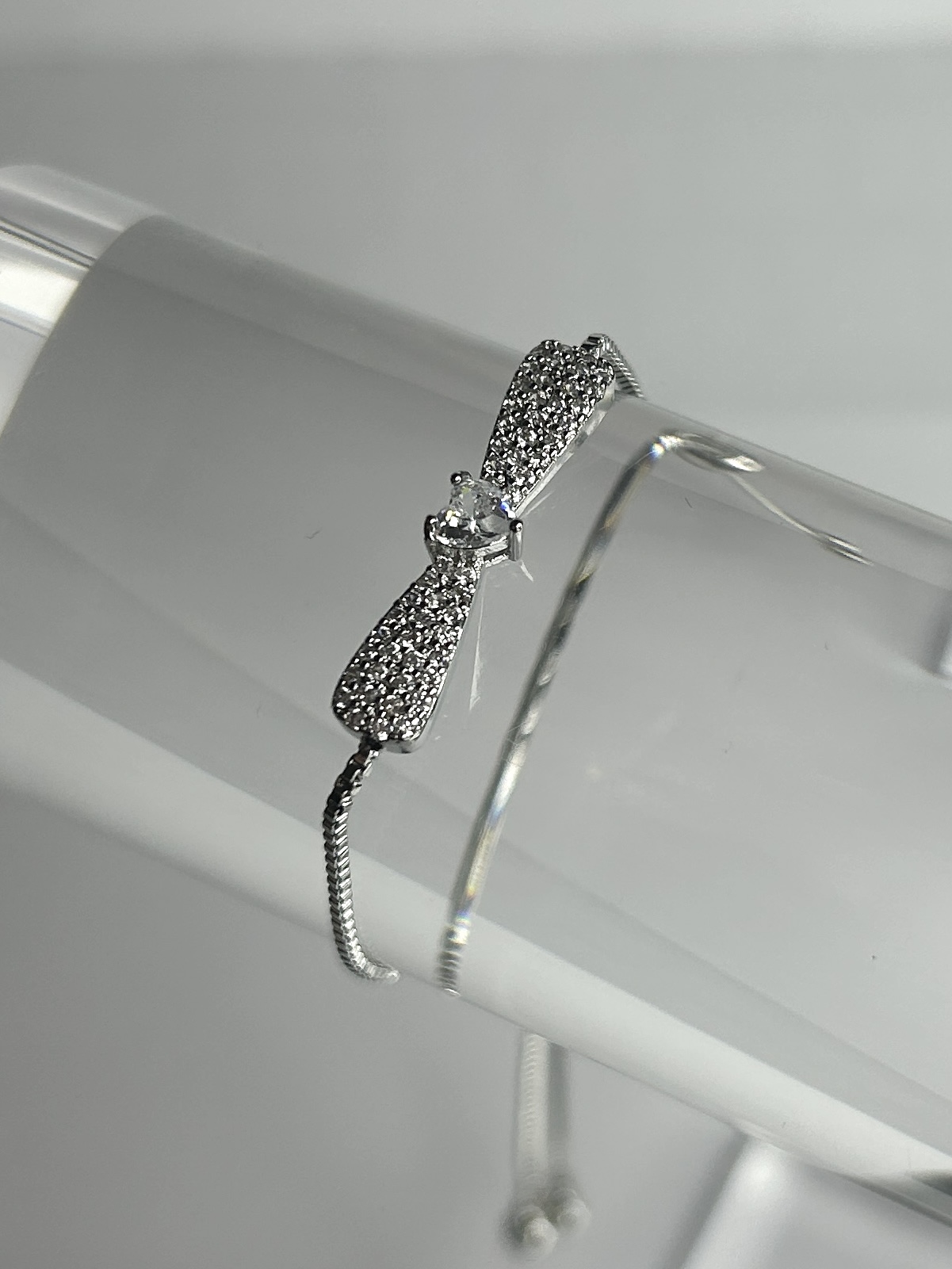 Silver Bracelet with a Bow Pendant, Silver Heart Gem in Middle. Filled With Smaller Silver Gems.