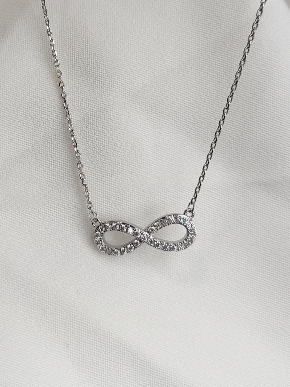 Silver Long Necklace With Silver Infinity Pendant, Filled with Smaller Silver Gems.