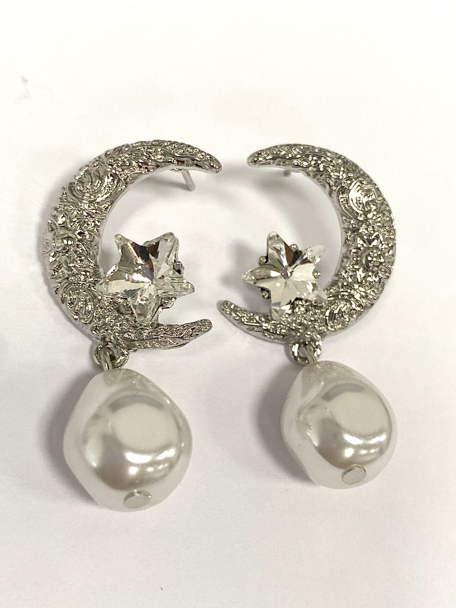 Silver Moon Star & Pearl Drop Earrings.