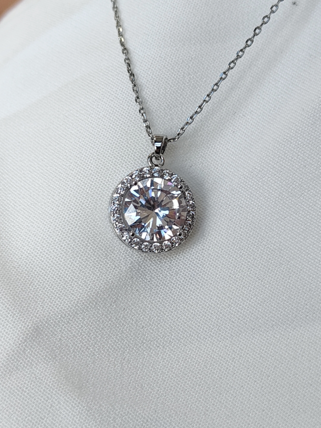 Silver Long Necklace With Large Silver Gem Pendant, Smaller Silver Gems Surrounding.