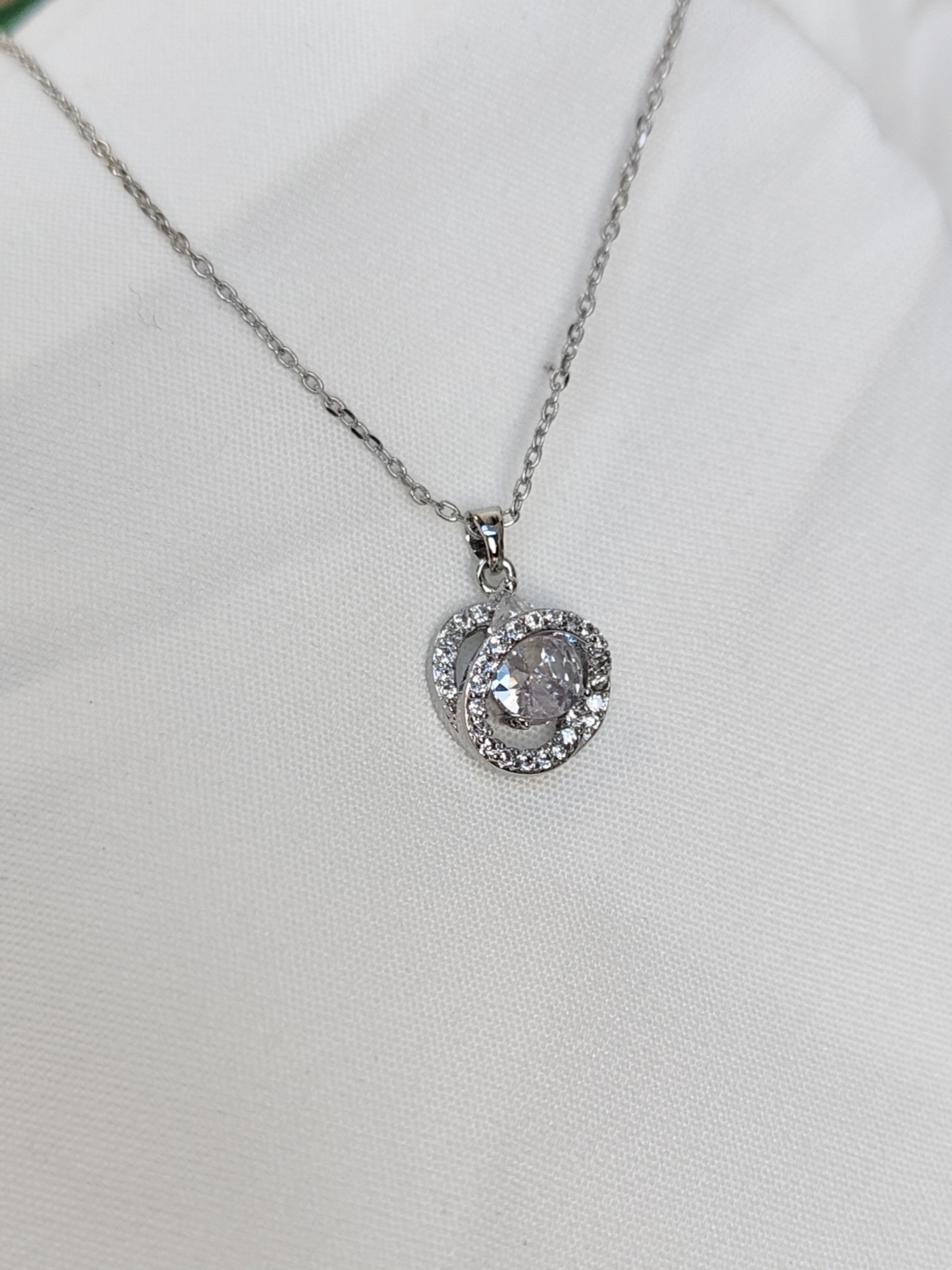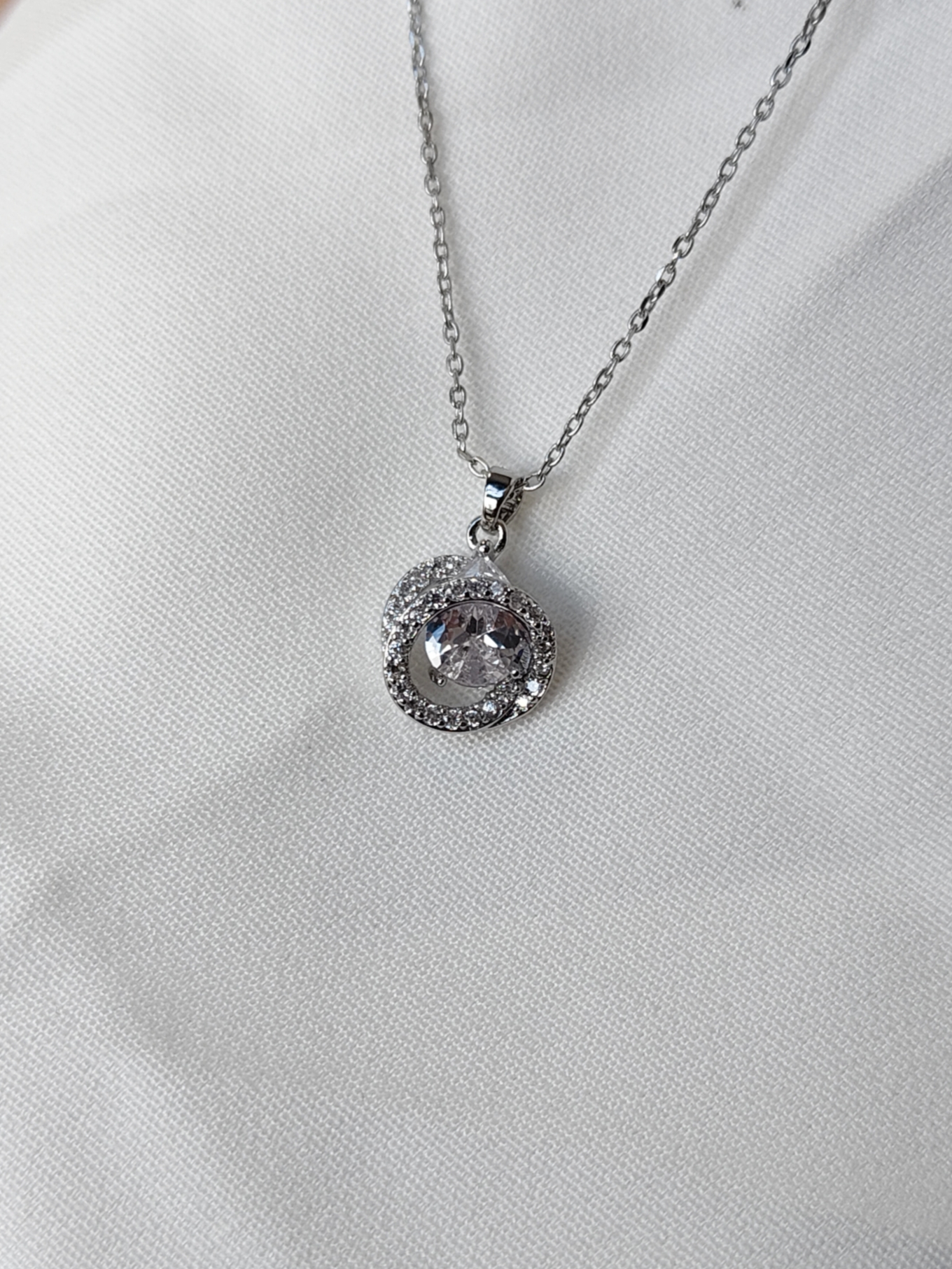 Silver Long Necklace With Small a Silver Pear Shape Gem Fitted between Two Silver Circles Filled With Smaller Silver Gems