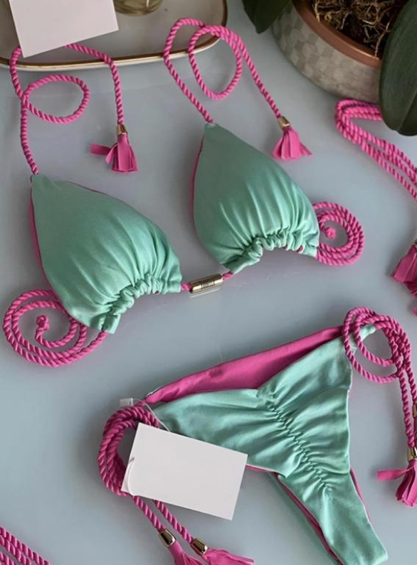 Turquoise/Pink Rope Triangle Thong Bikini