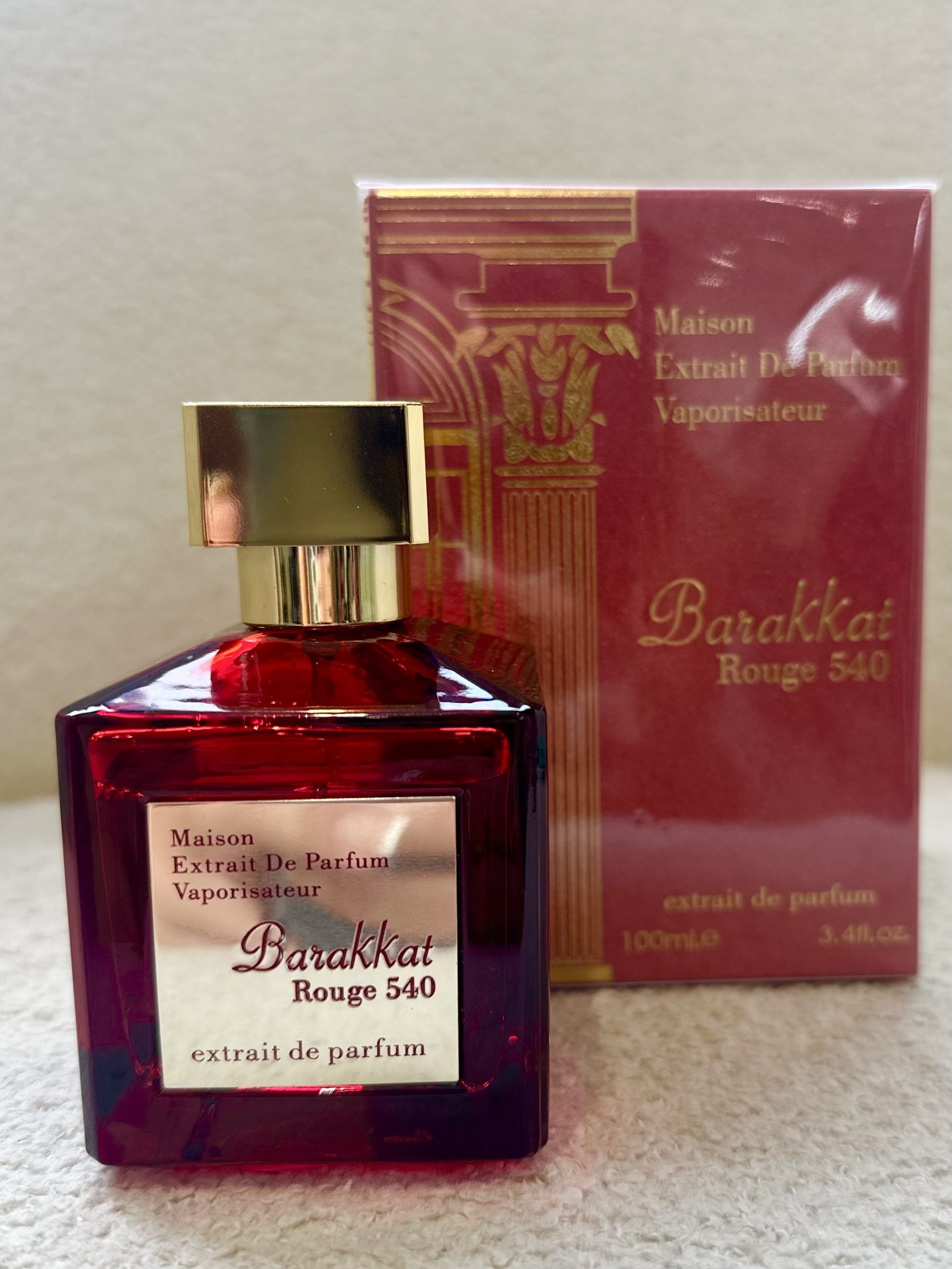 Barakat Rouge 540 Edp Perfume Spray square red bottle, with gold lid . comes in sturdy boxed packaging.