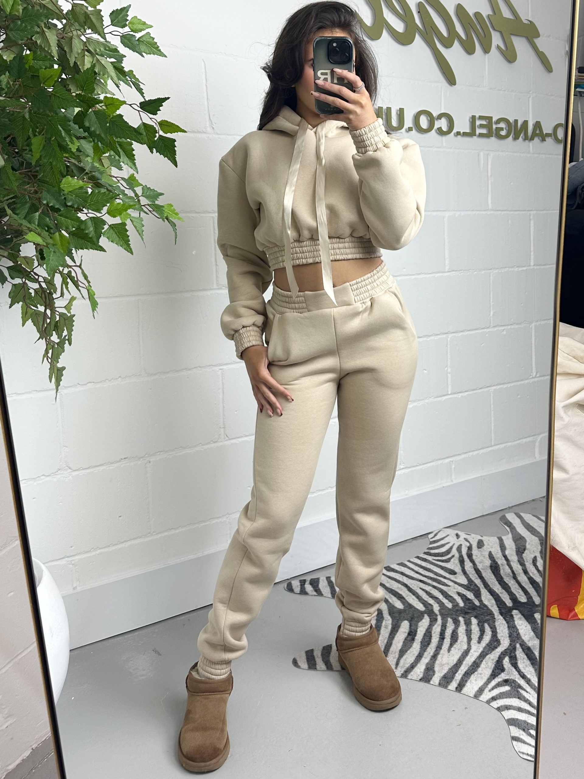 Beige Cropped Ribbon Hoodie Tracksuit 8260