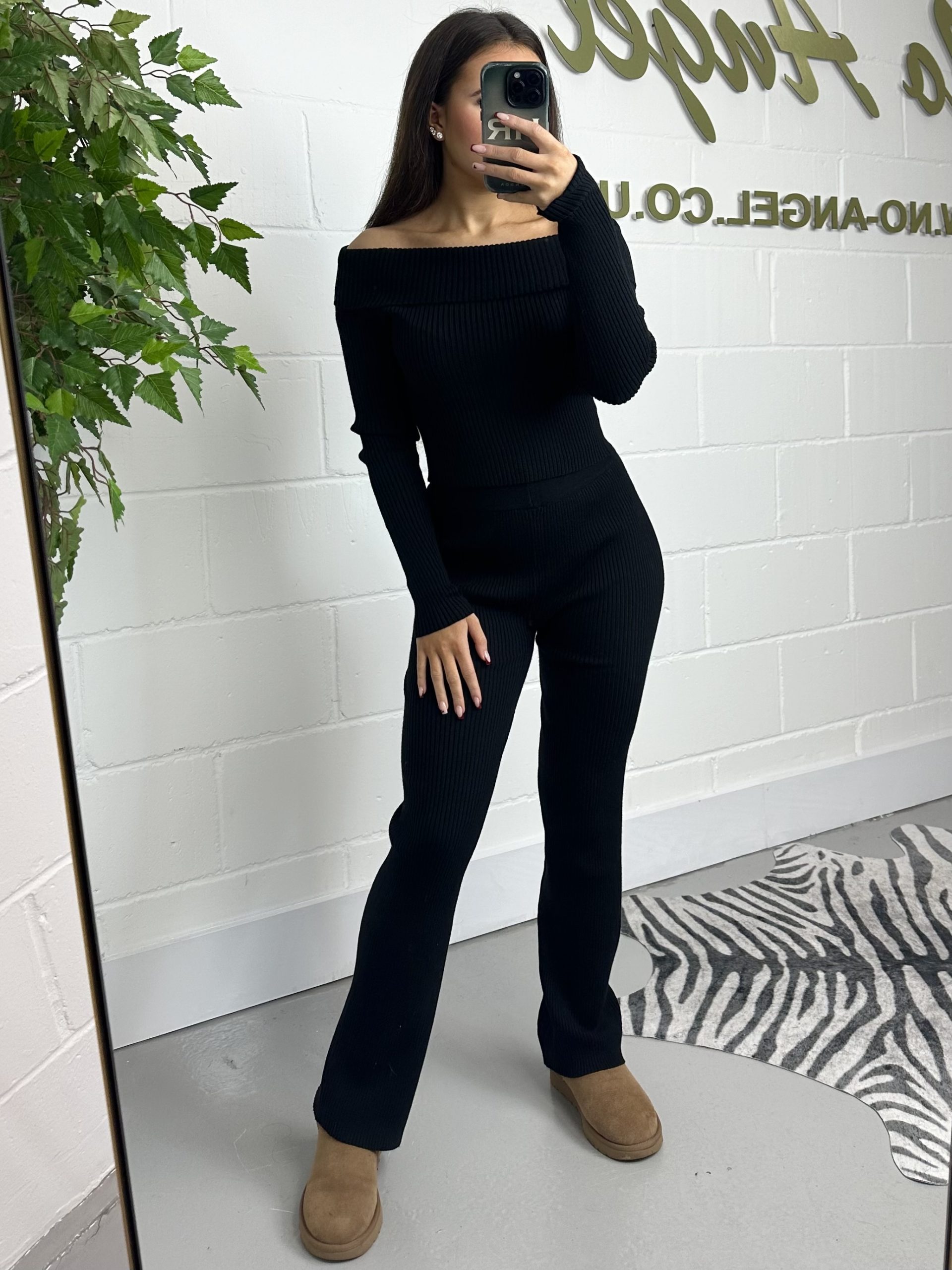 Cream Knitted Bardot Ribbed Flared leg Co -Ord 8024