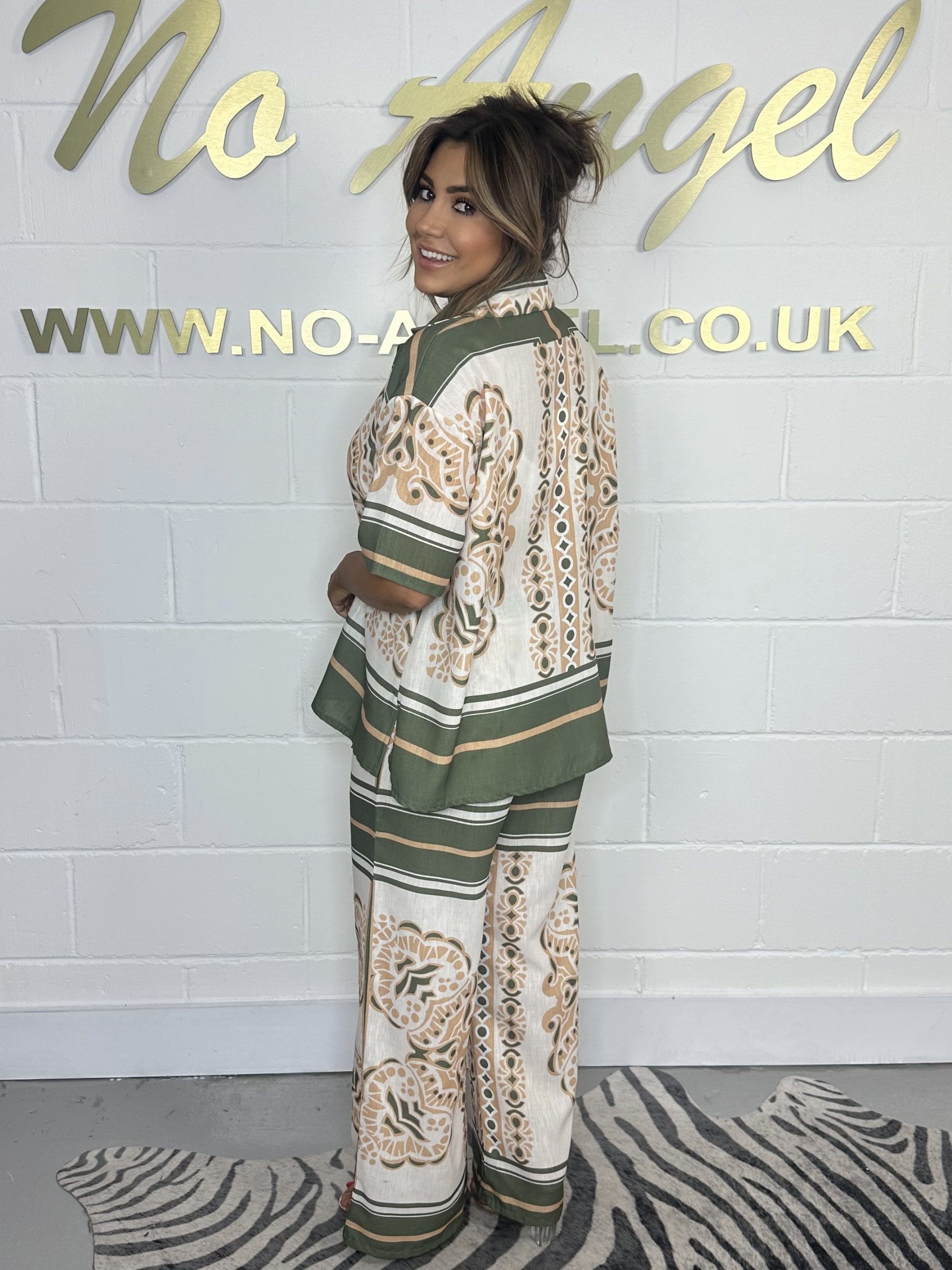 Khaki & Cream Printed Shirt & Trouser Co-Ord 449