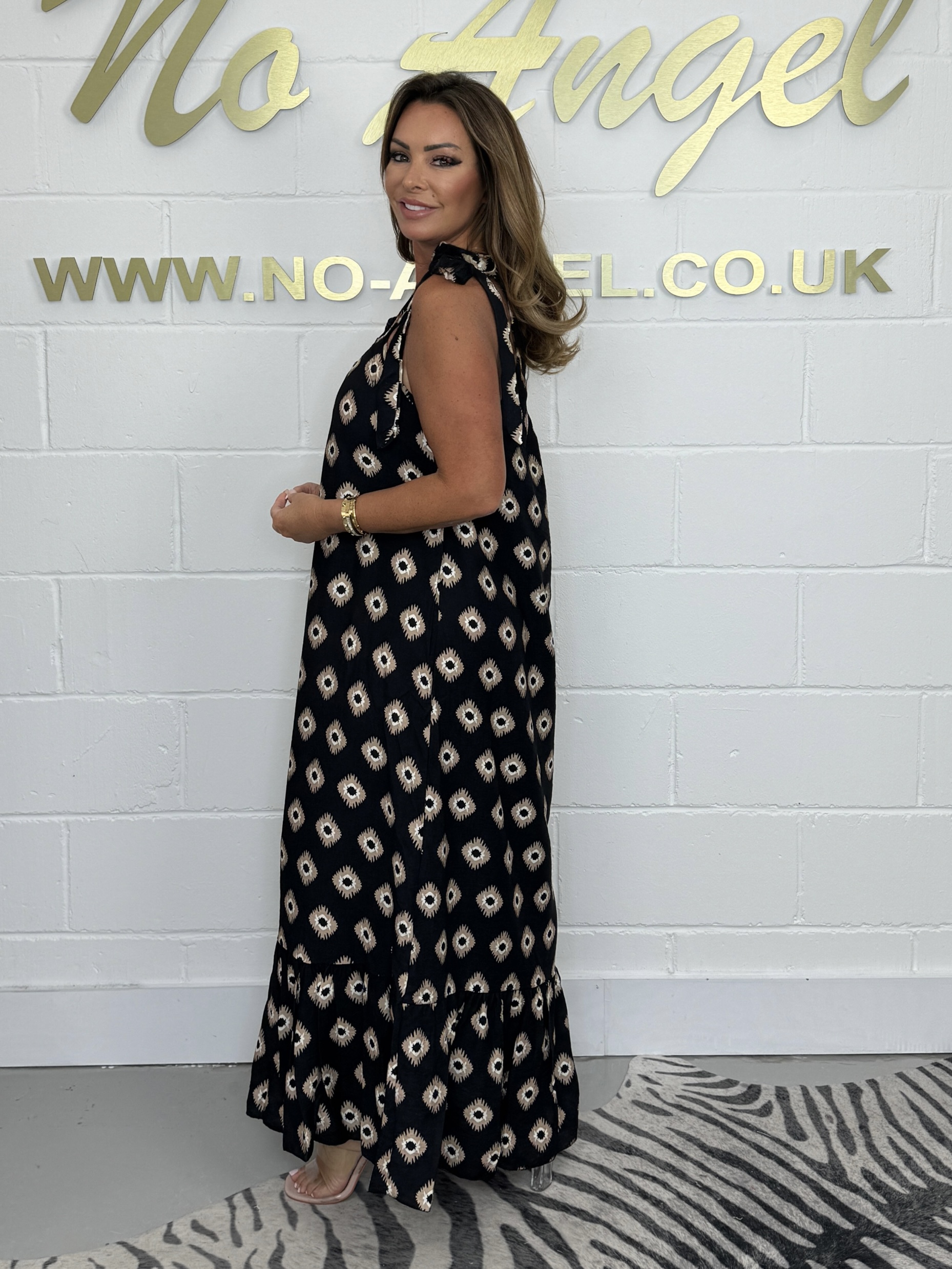 Diamond Printed, Adjustable Tie One Shoulder Maxi Dress. 80% Viscose 20% Nylon