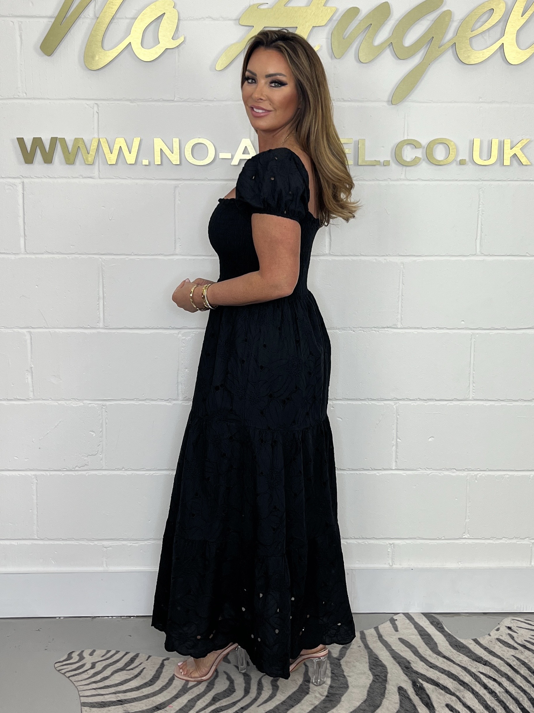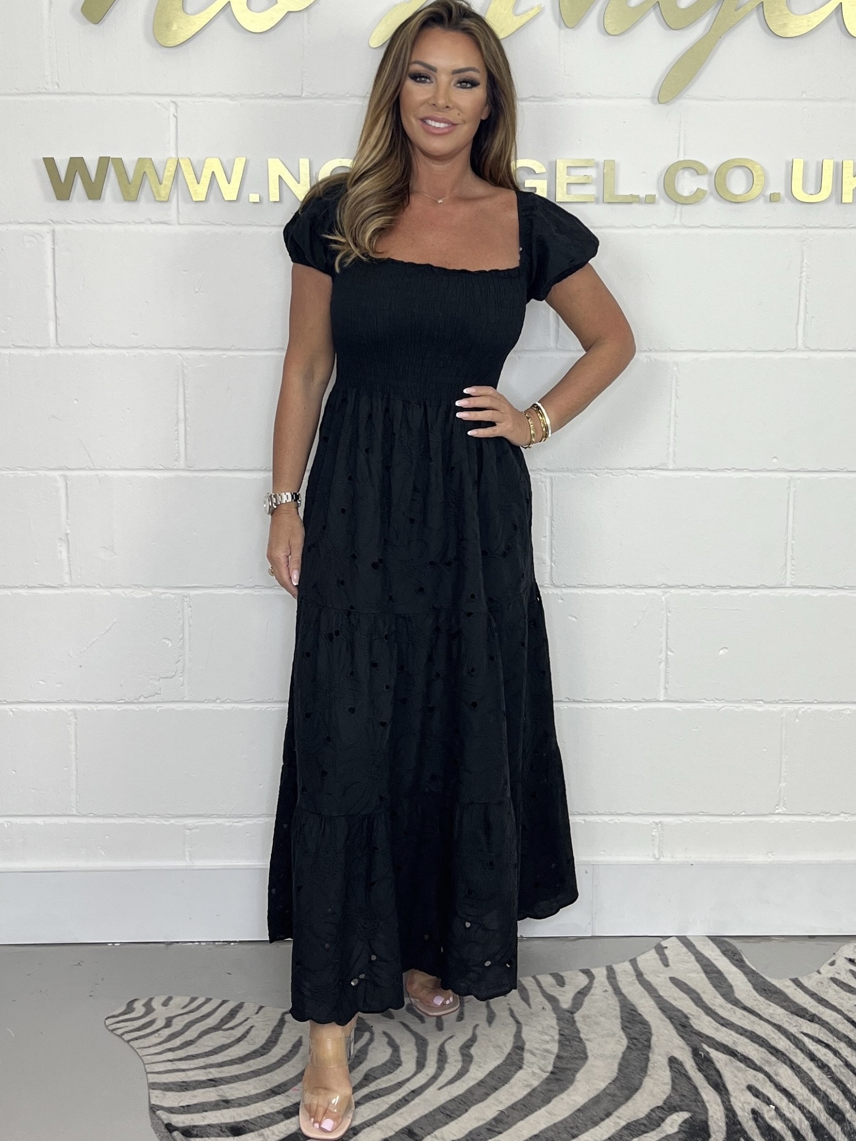 Embroidery Anglaise Smocked Bodice Maxi Dress With Short Puff Sleeves & A Square Neckline.