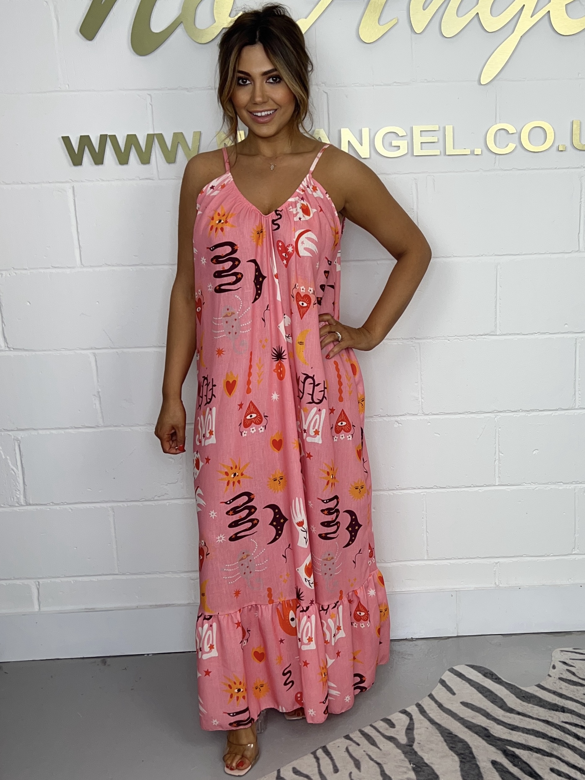 Pink printed, Linen Mix, Spaghetti Strap Maxi Dress. 50% Viscose 30% Polyester 20% Linen