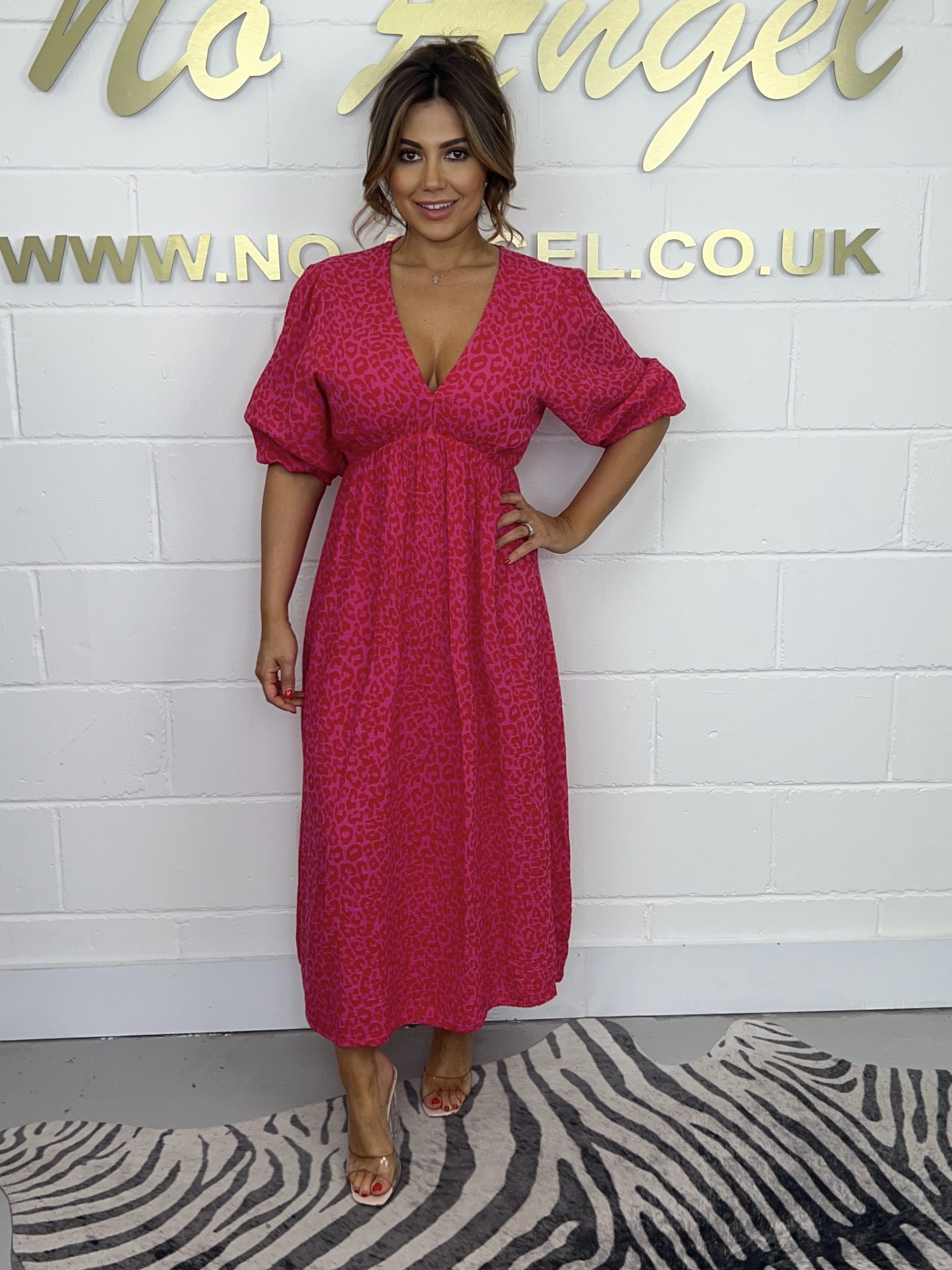 Pink/Orange Leopard Printed V Neck Midi Dress , Elasticated Under Bust , Low V Tie Back.