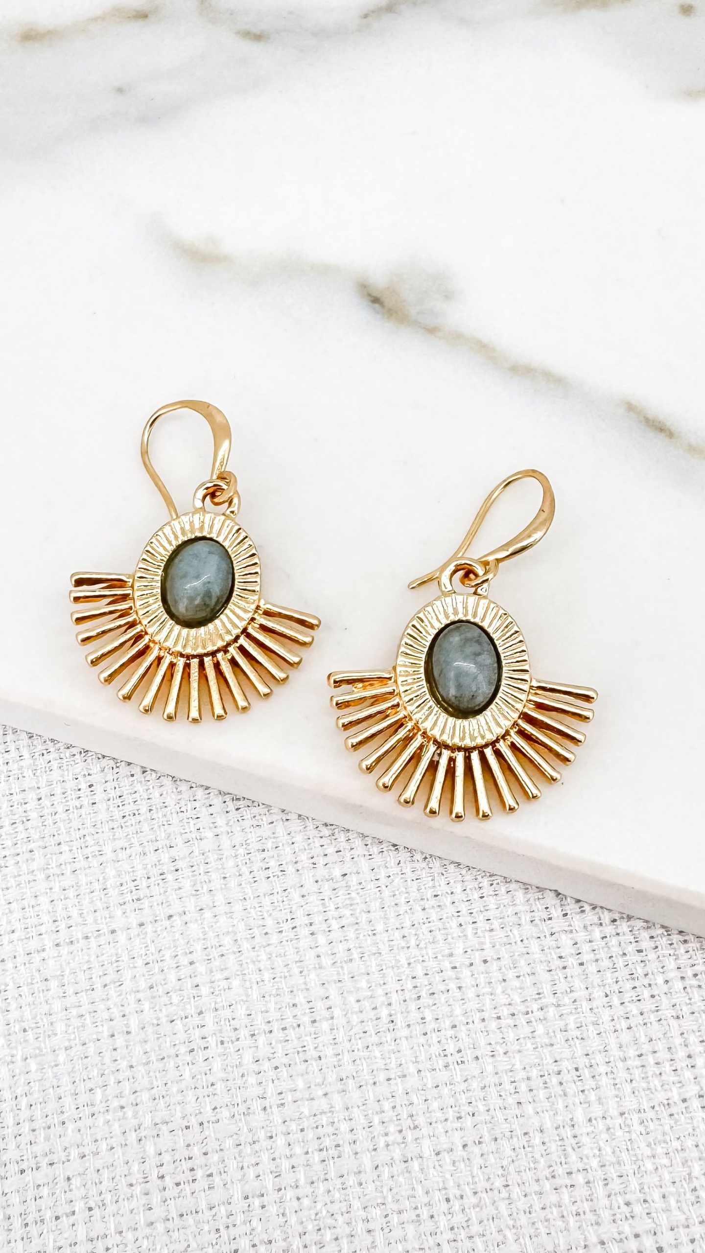 Gold Hanging Fan Earring With Grey Gem Detail.