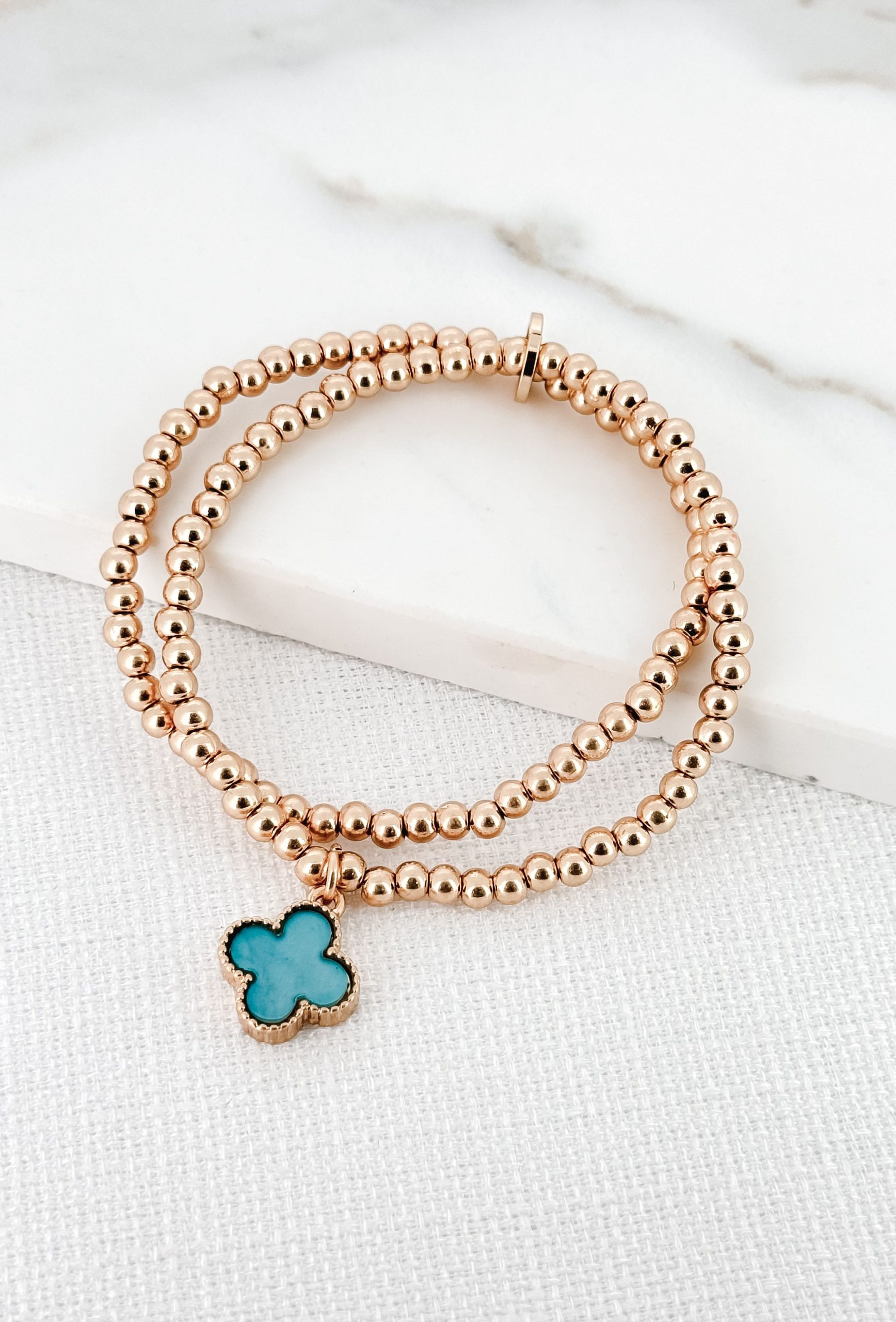 Gold Double Beaded Bracelet With Turquoise Clover Pendant.