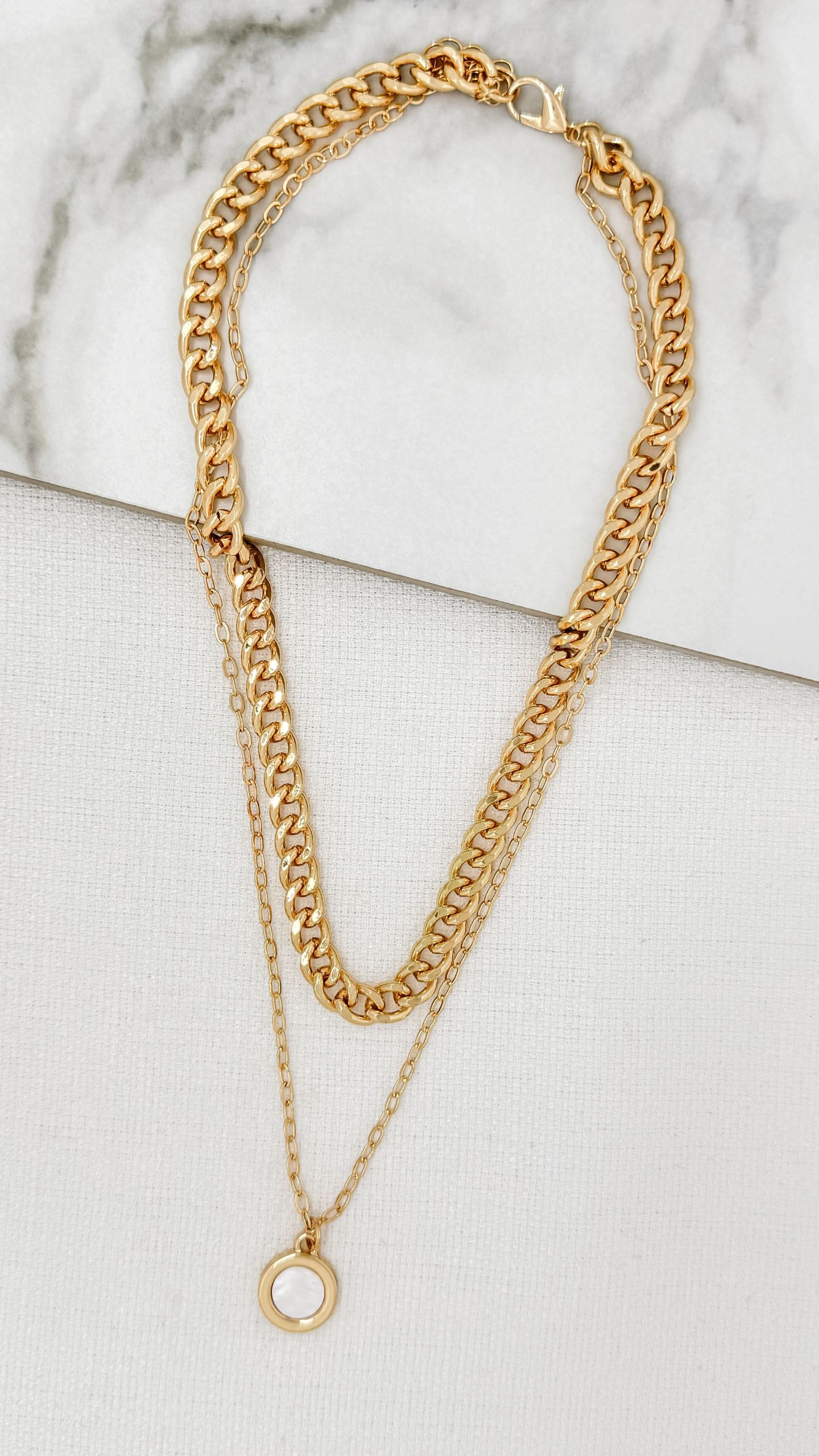 Gold Double Chained Necklace With Mother Of Pearl Circle Pendant