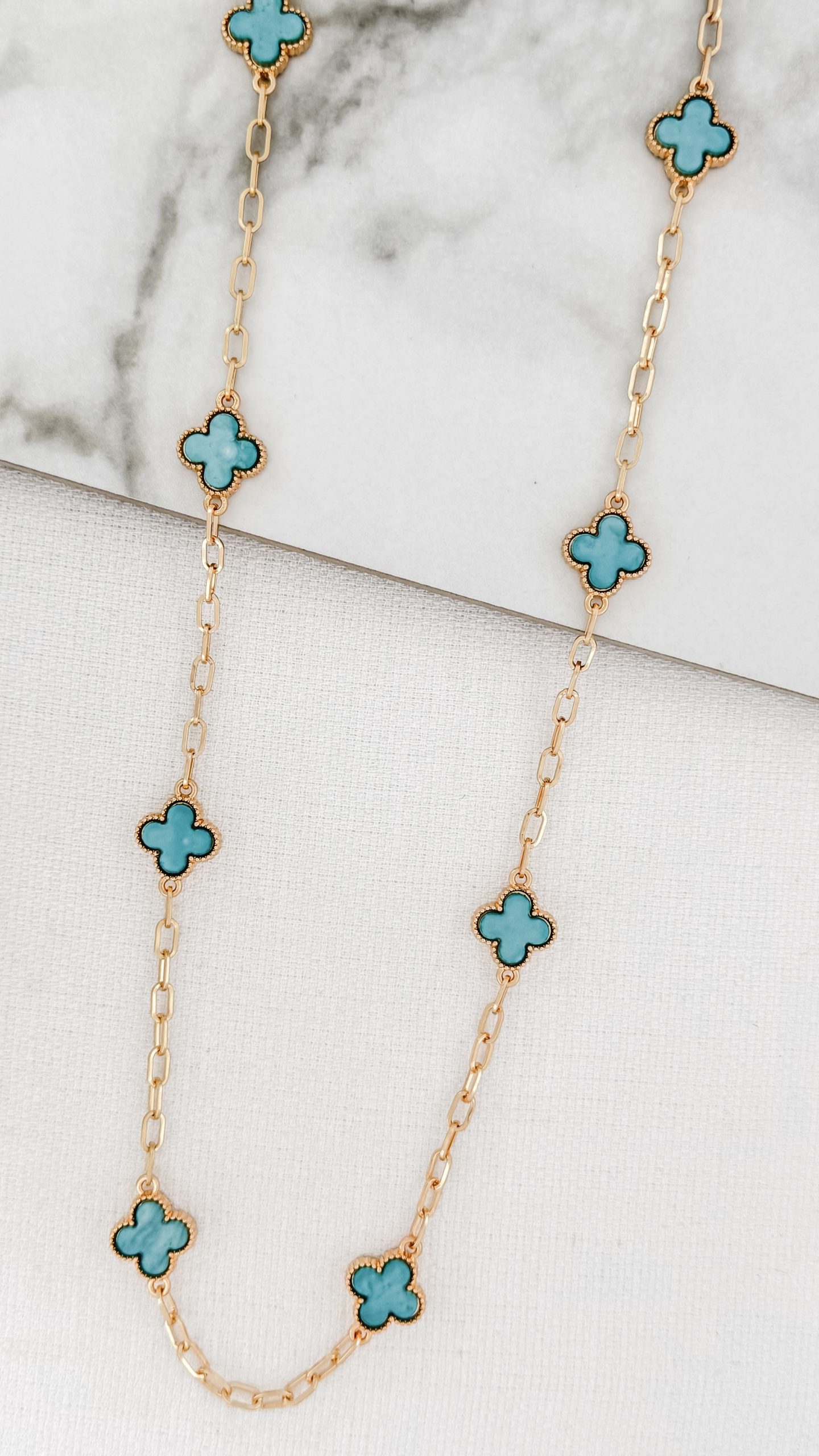 Gold Long Chain Blue Clover Necklace.