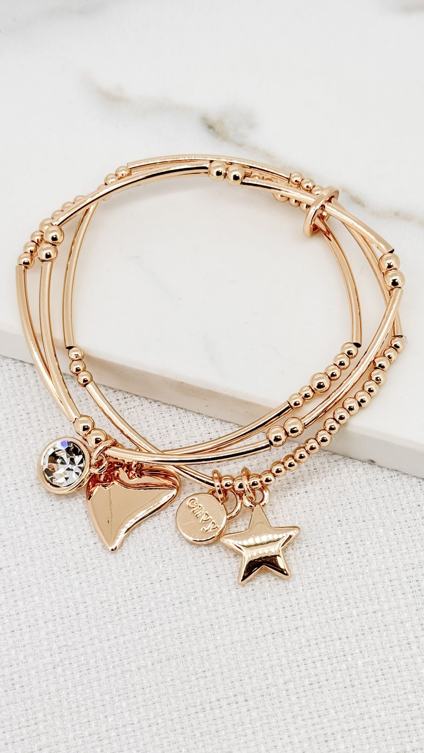 Gold Three Loop Heart And Star Charm Bracelet.