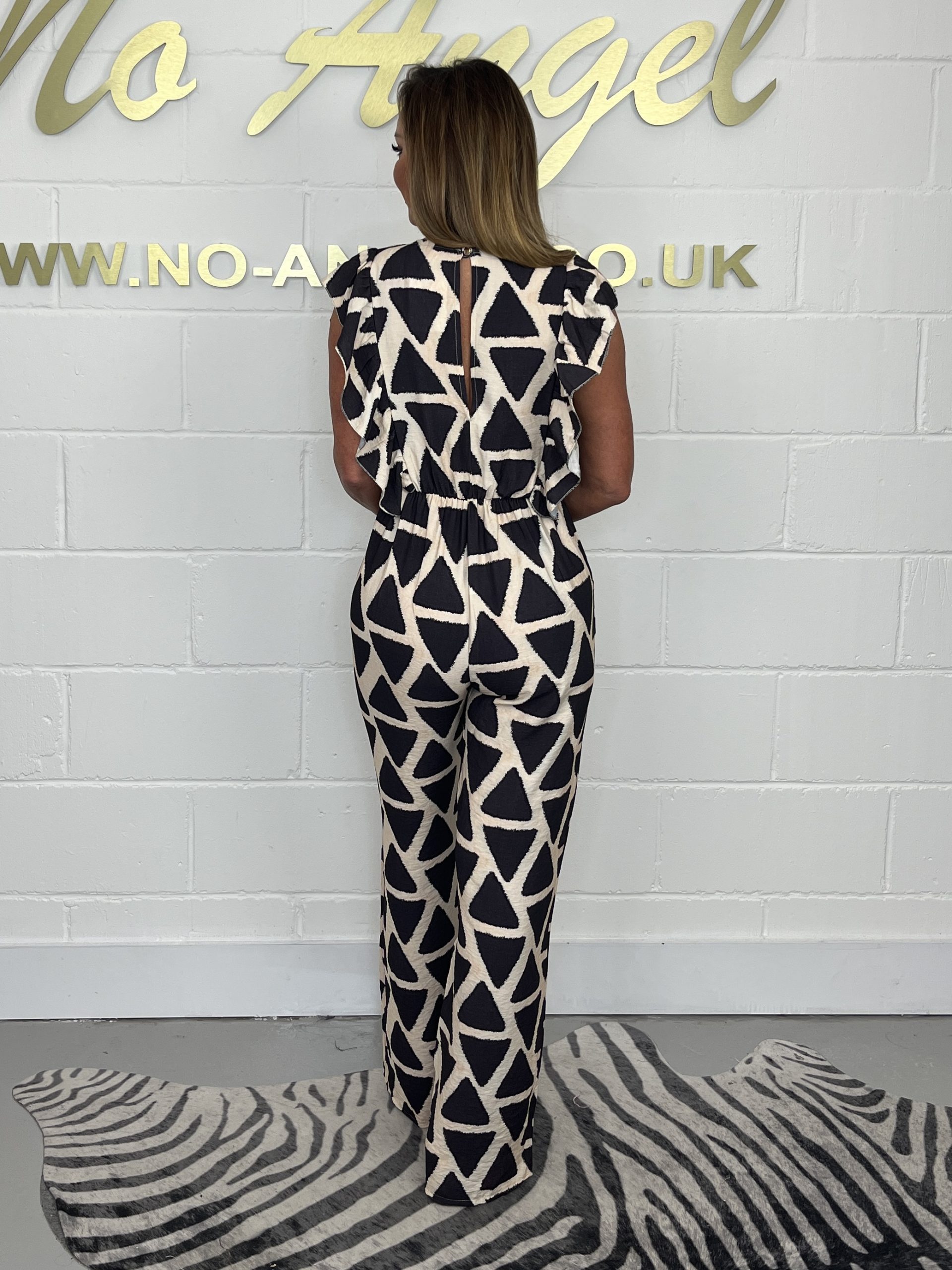 Black Print Ruffle Sleeveless Knot Middle Jumpsuit 752