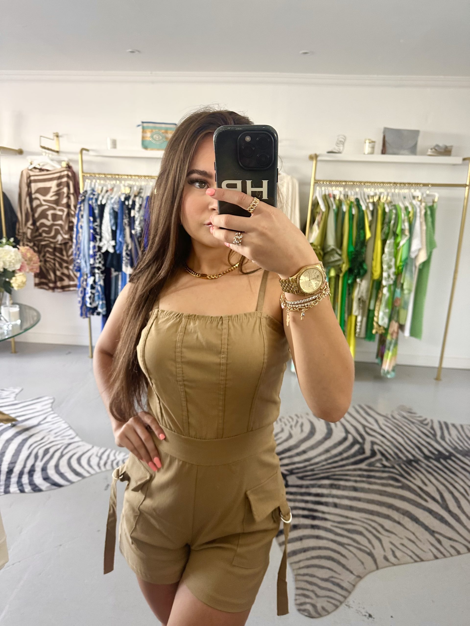 Tan cargo thin strap playsuit , adjustable straps can be worn up or down , with pocket on the shorts.
