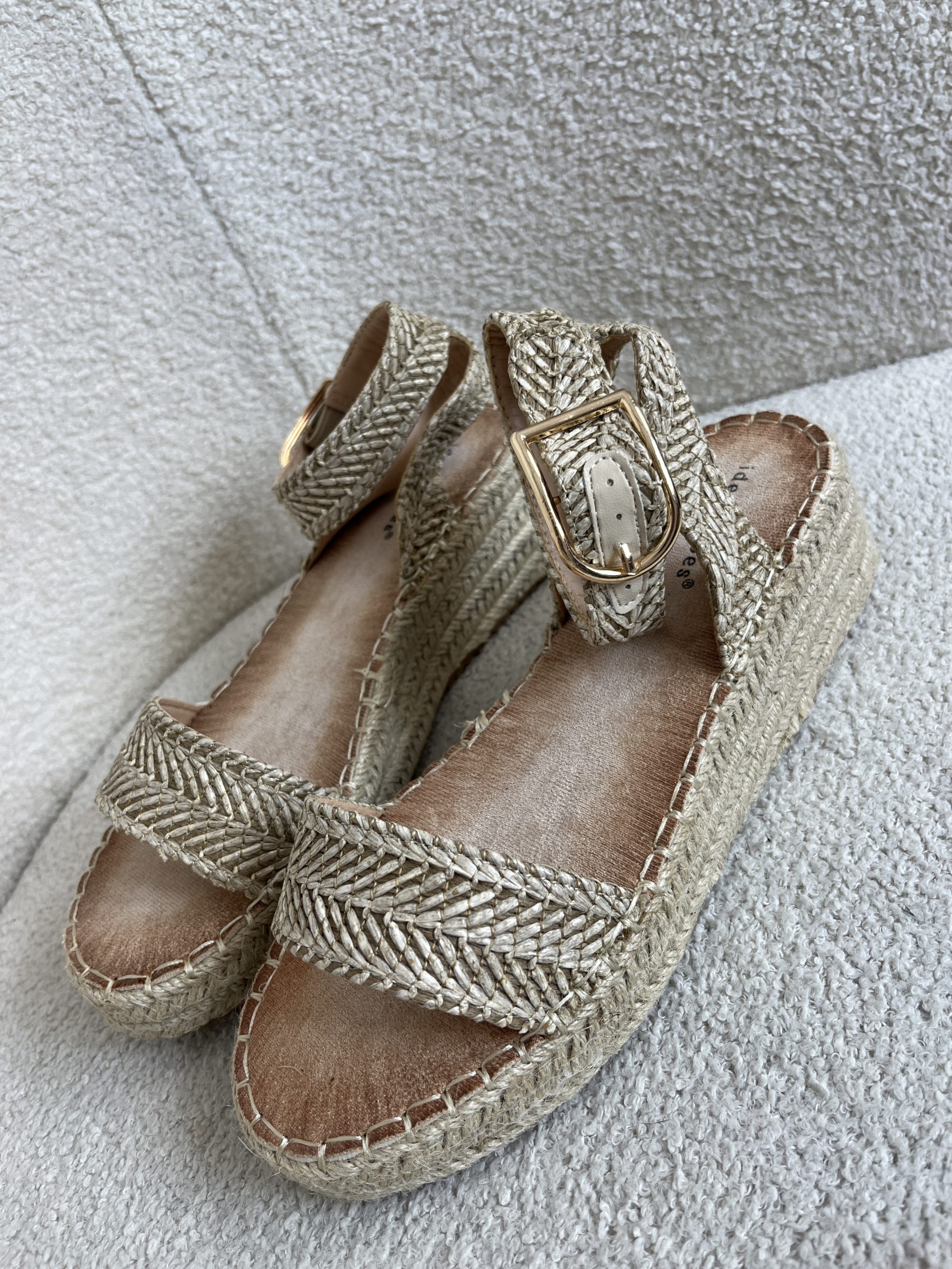 Beige Woven Ankle Strap Gold Buckle Platform Sandals