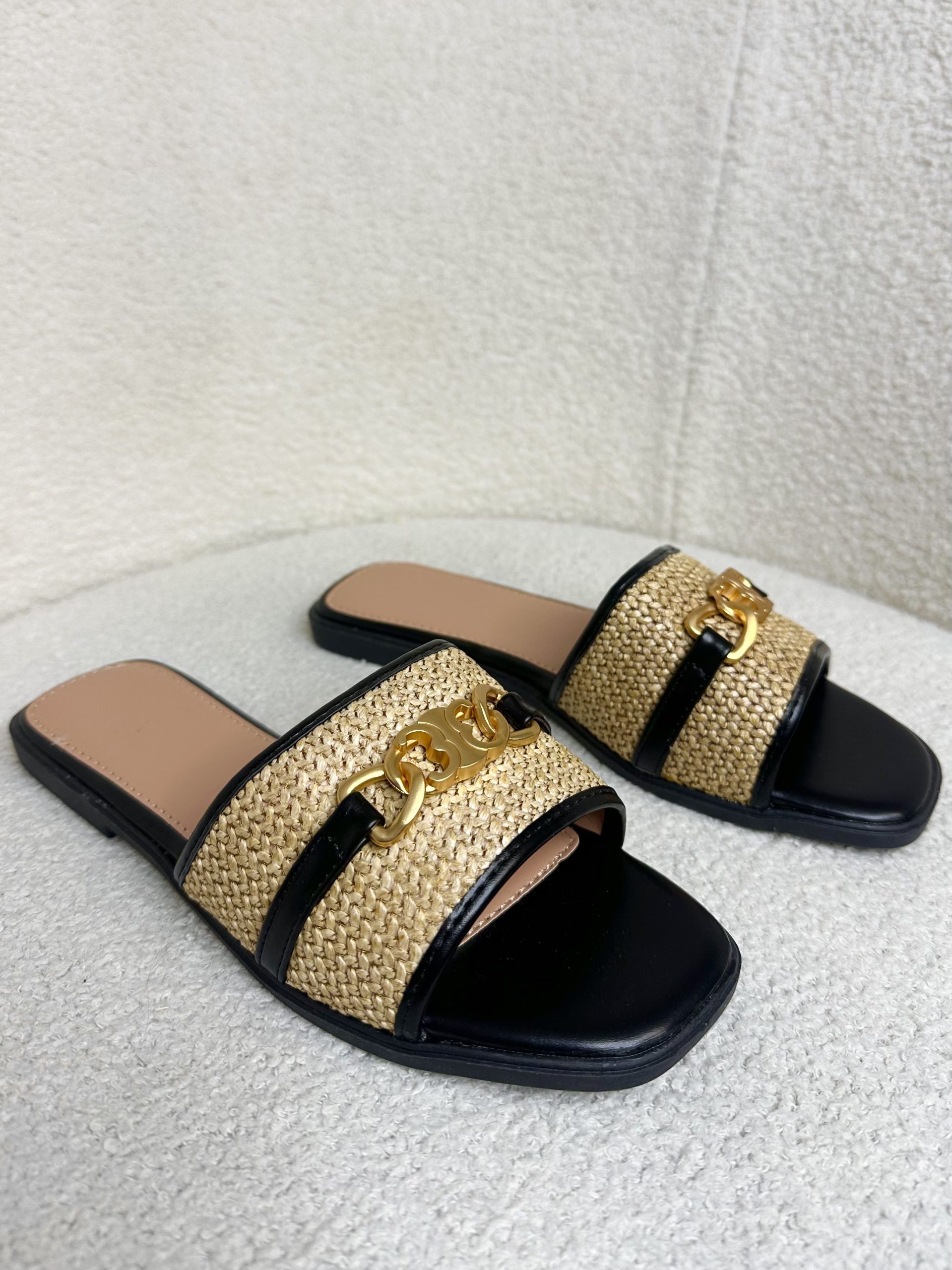 Black Woven Detail Gold Buckle Sliders 338
