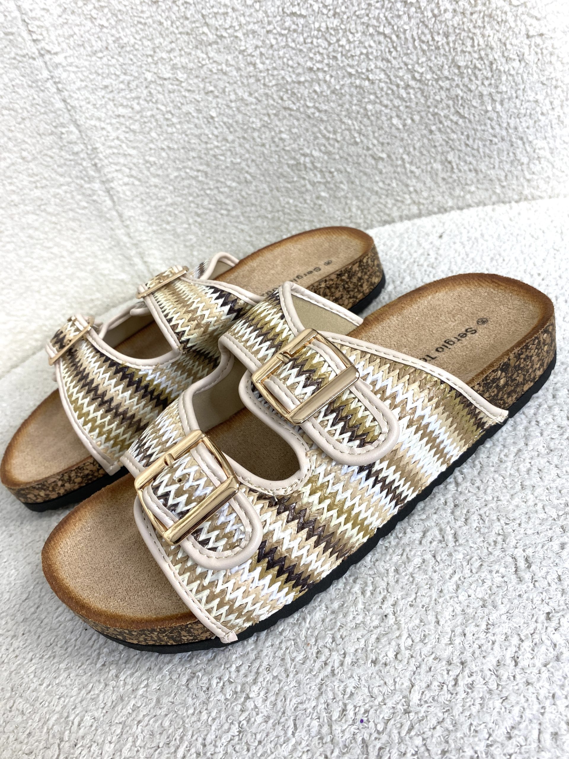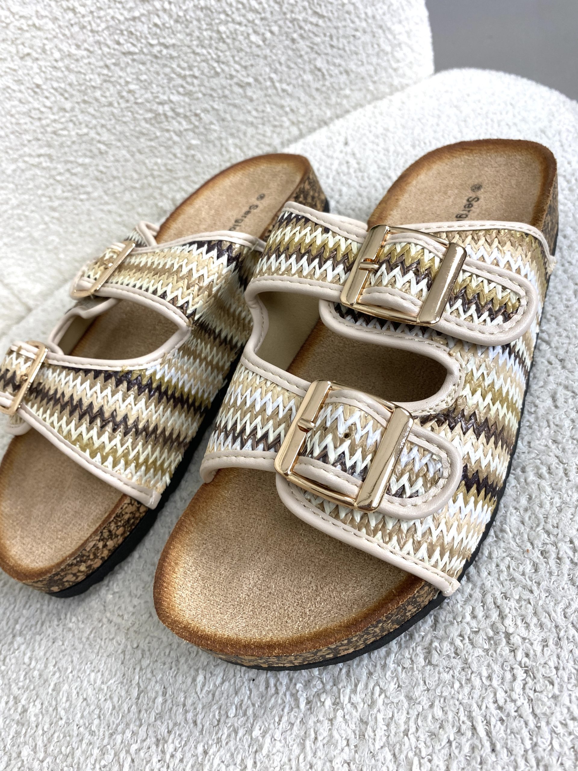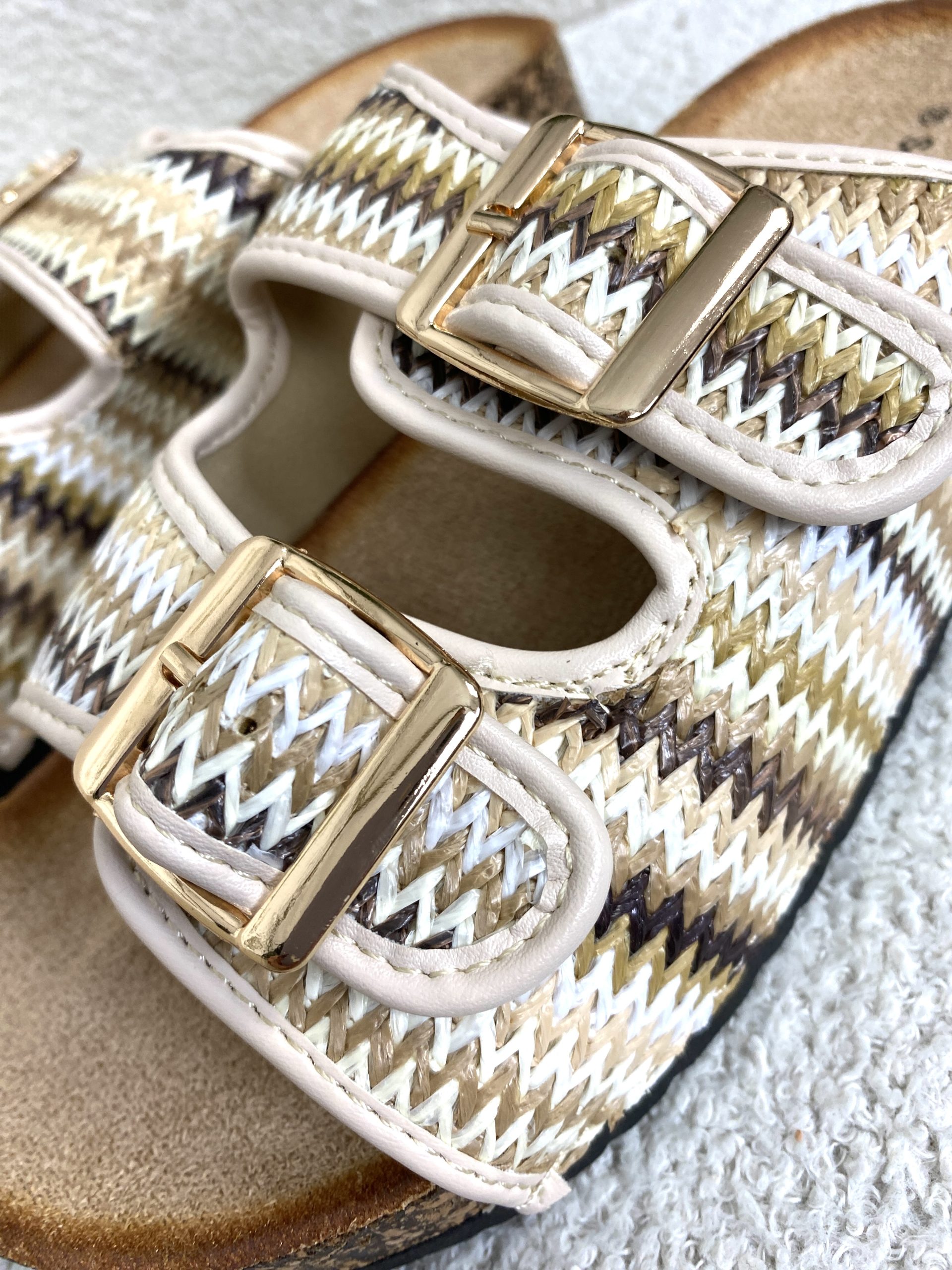 Cream/Beige/Brown ZigZag Birkenstock Style Sandals , Double Buckles With A Cork Sole.