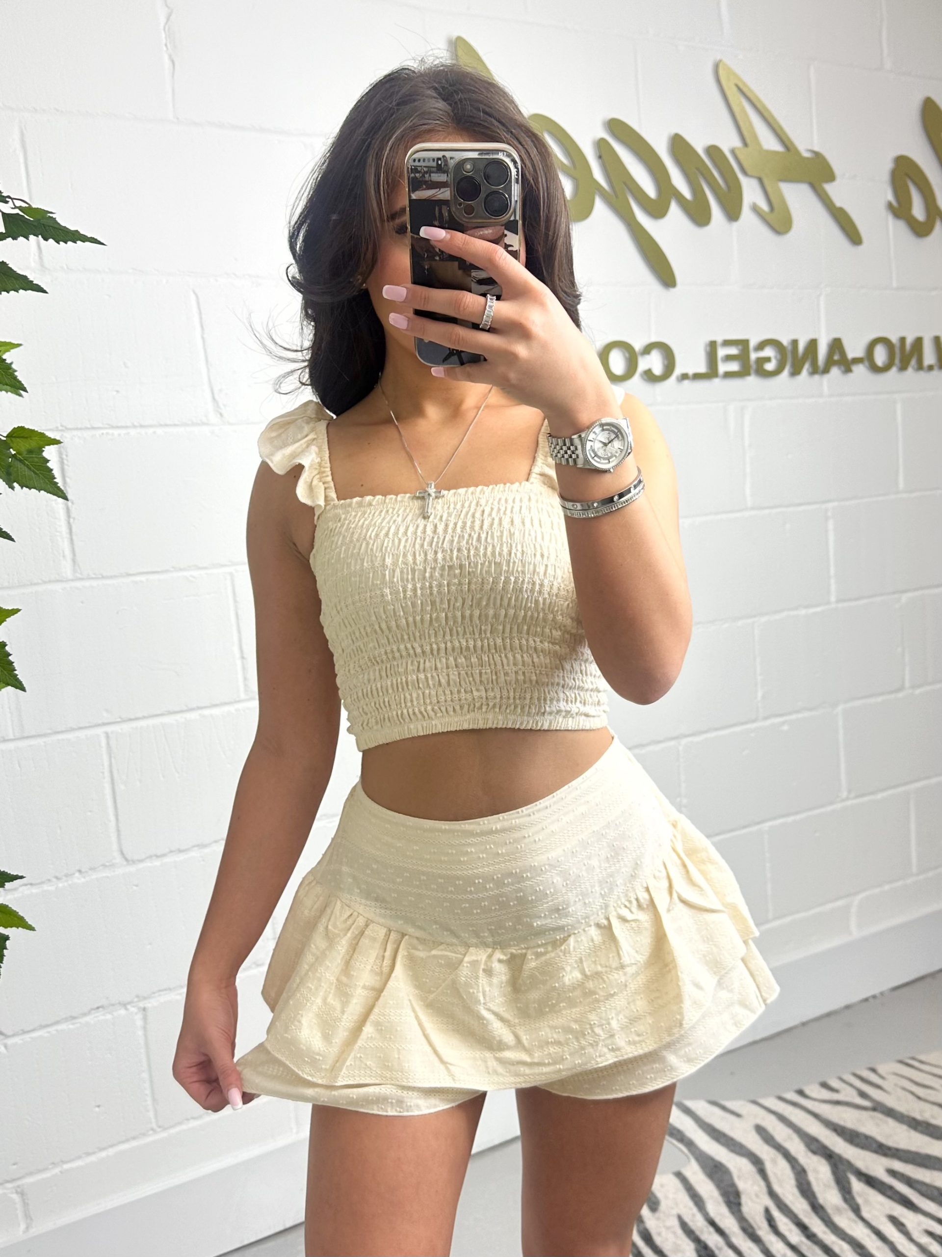 Beige Ruffle Smocked Top With Frill Skort Set