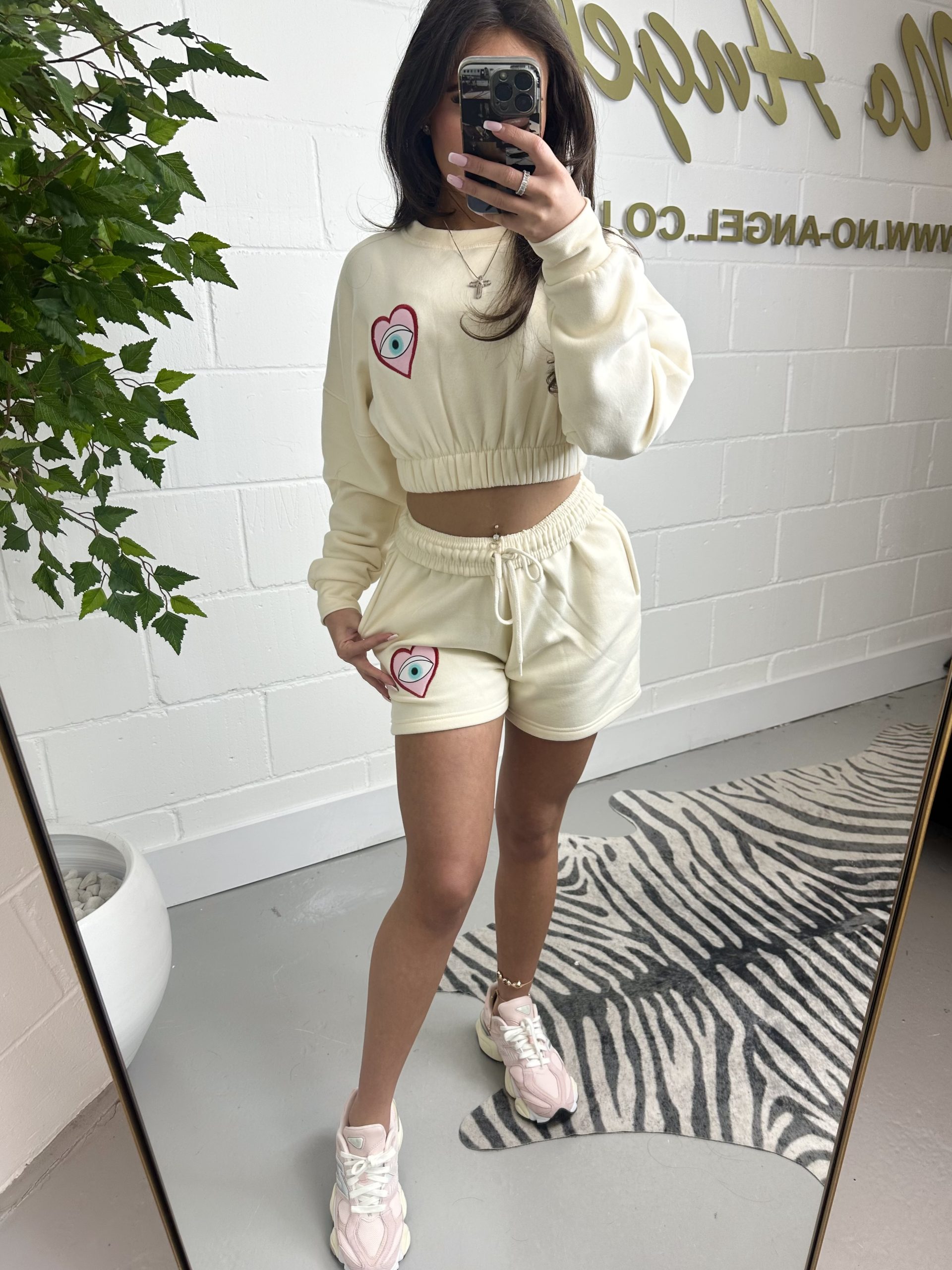 Cream Cropped Heart Evil Eye Shorts Set 9956