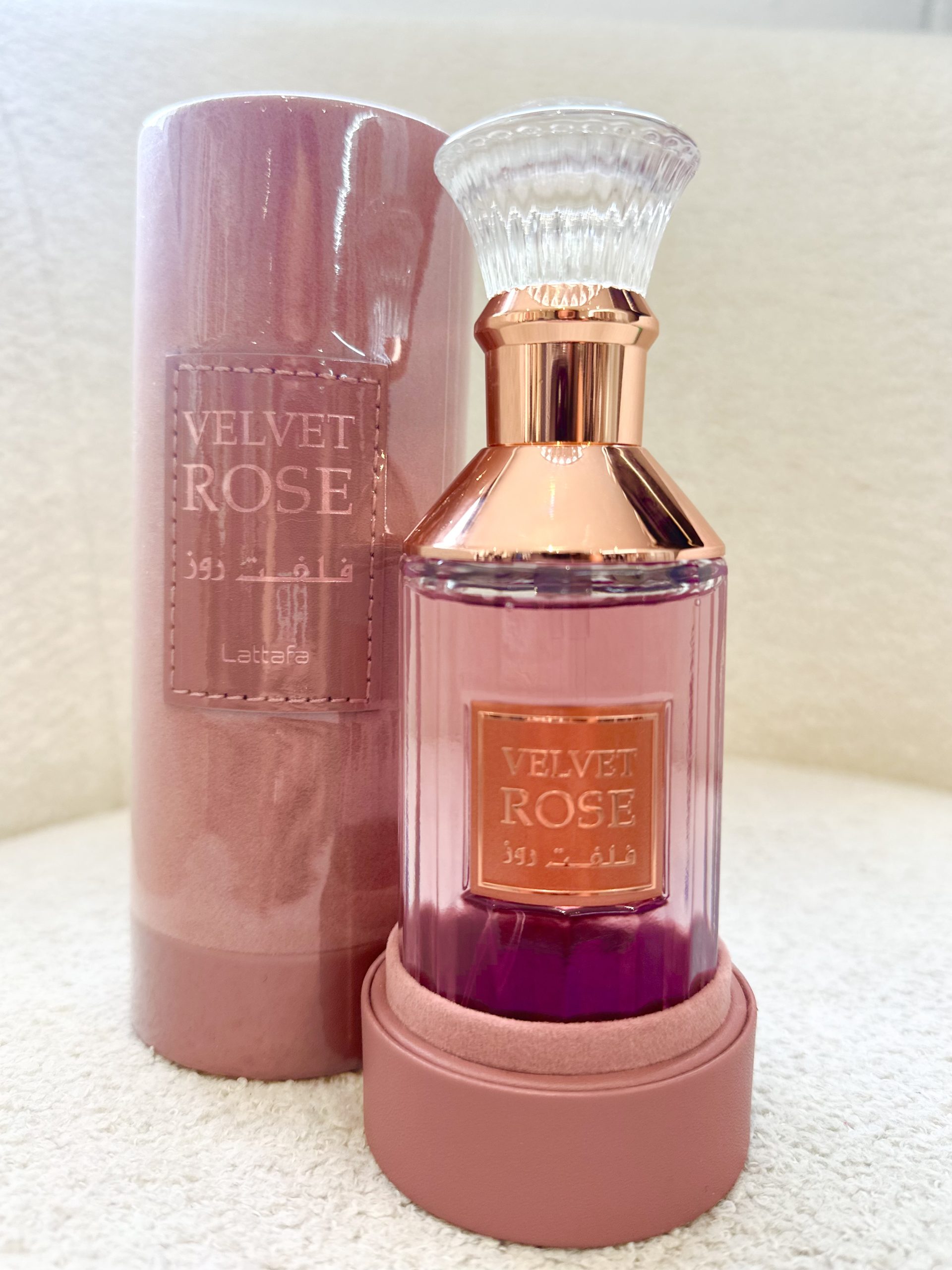 Velvet rose , dusty pink liquid in clear cylinder bottle with rose gold and clear top . Comes packaged in sturdy suede box .