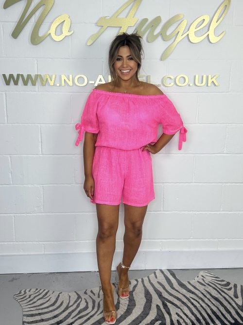 Neon Pink Linen Bardot Tie Playsuit 535