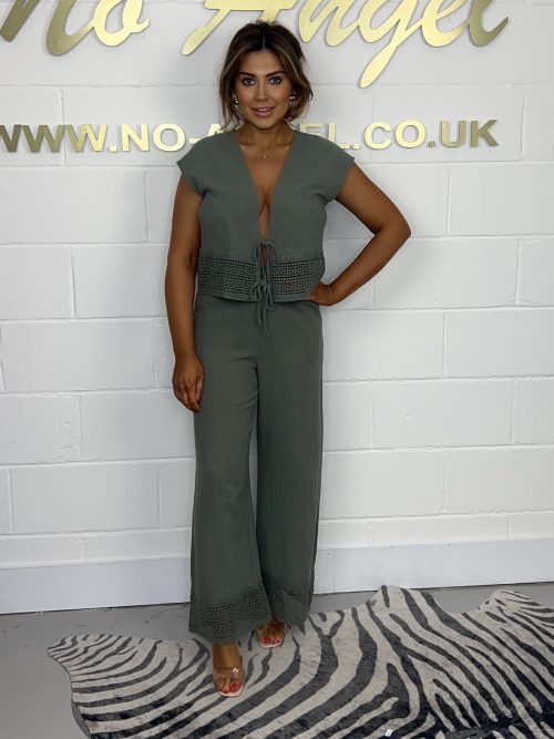 Khaki Tie Crochet Detail Top & Matching Trousers 675
